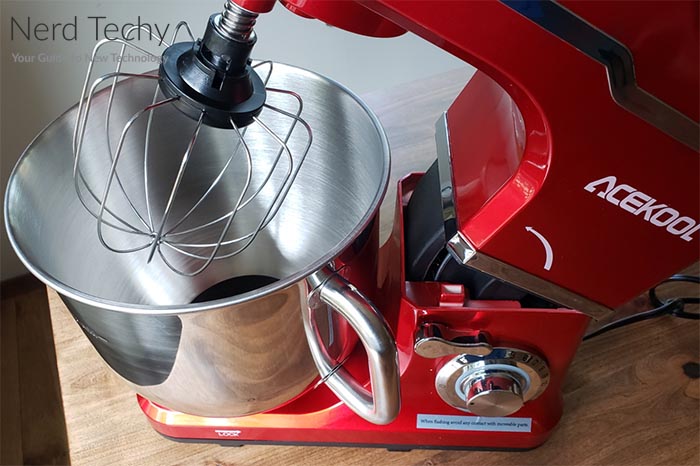 除了主混频器单元,你还可以得到一些对其操作至关重要的配件。首先,你需要一个7.5夸脱的不锈钢搅拌碗。这个碗是完美的形状和大小为Acekool混合器。它完美地坐落在底部,并且对于所有的混合附件都有正确的曲线。甚至还有一条很有用的“Max”线,让你知道碗太满了,无法搅拌。搅拌工具包括搅拌器、搅拌棒/搅拌桨和面团挂钩。还有一本小烹饪书,里面有一些食谱。这并不是什么开创性的发明,但如果你只是想快速制作一条面包的话,它还是很有用的。