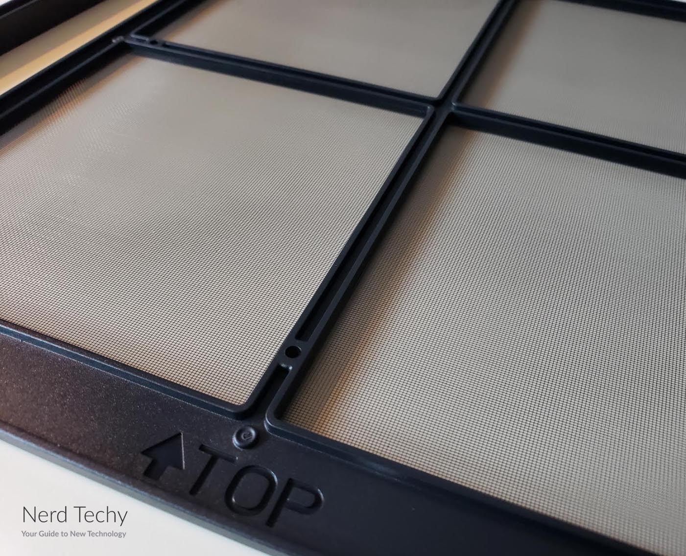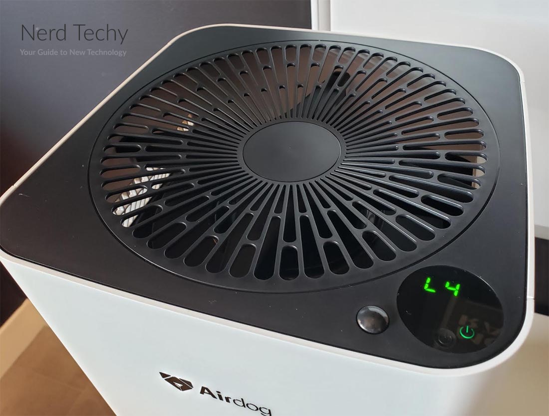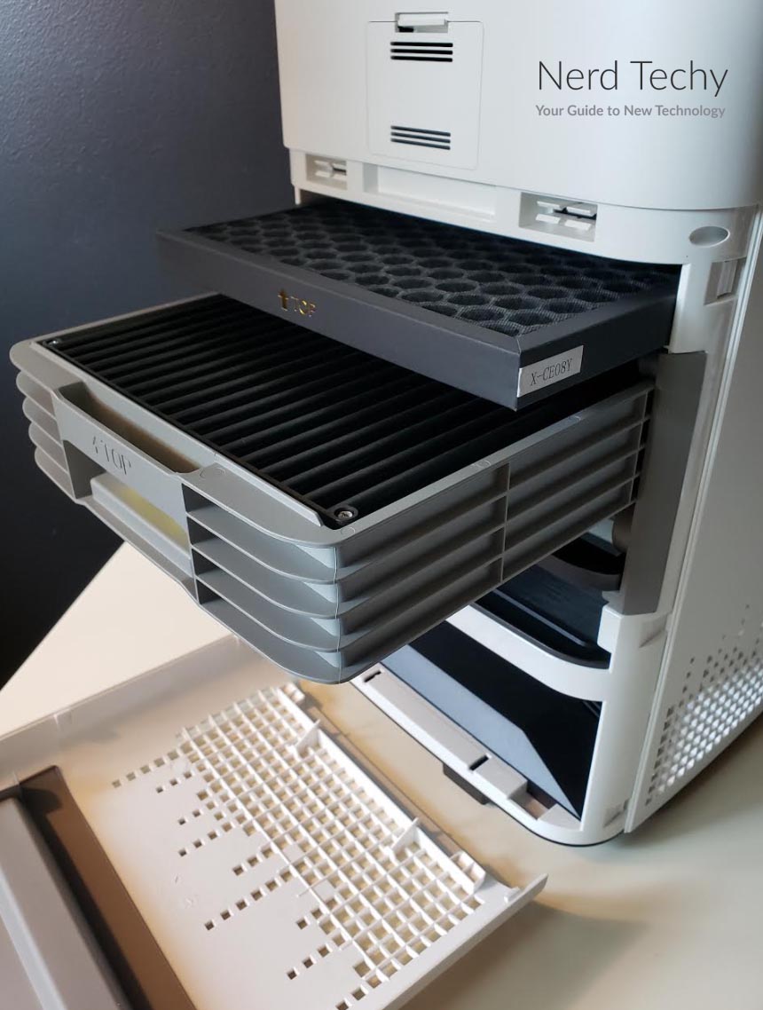 在X3上,进气通风口位于壳体的底部。它们具有网格式设计,它们以不规则的条形图模式布置。我们无法判断此模式是否有任何特定的目的,但它看起来很整洁。然后空气通过过滤器,该过滤器位于单元的下半部分。在本机顶部的风扇通过顶部的径向黑色通风口排出空气。有一个位于顶部的一个角落的单个电源按钮。点击它以循环三种不同的速度,电流速度由LED灯指示。