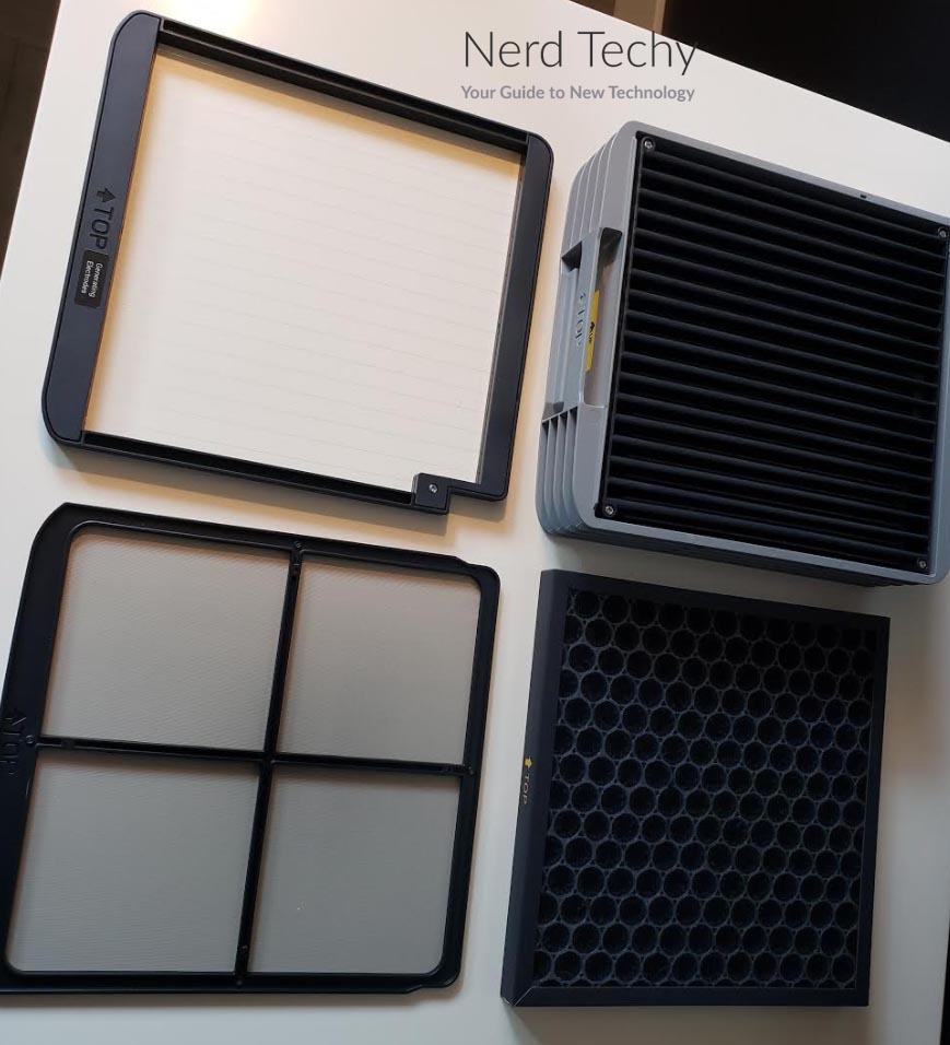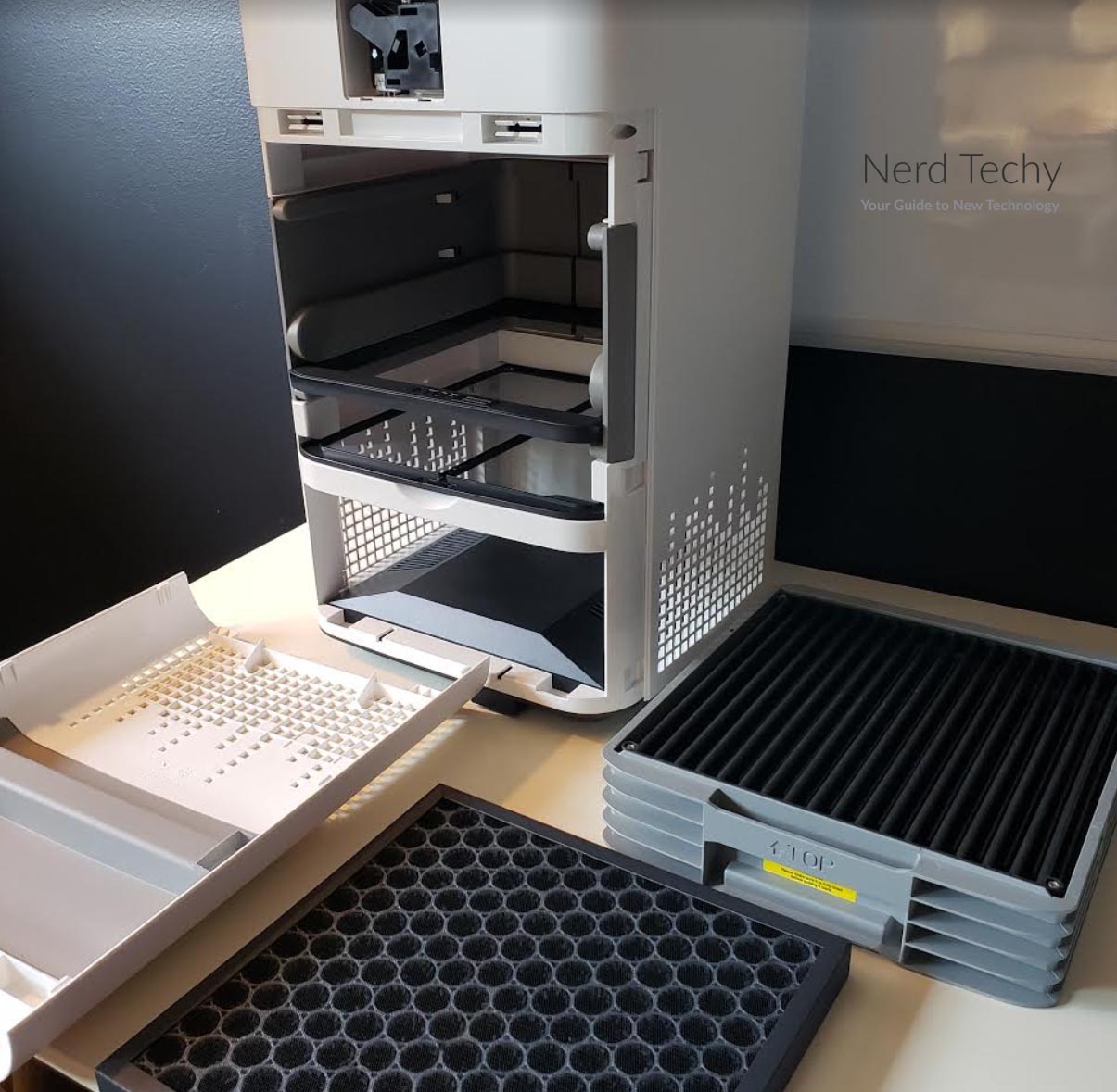 第一的,简单的预过滤器屏幕去除像PET头发和尘埃兔子这样的大颗粒。这个预过滤器屏幕实际上是在外面;这是壳体上的网格状进口。保持该部分净化器只需要用湿布快速擦拭。除此之外,其他一切都在壳体内,并在洗碗机中清洁。