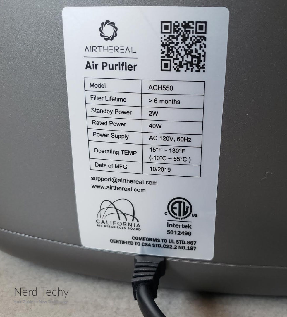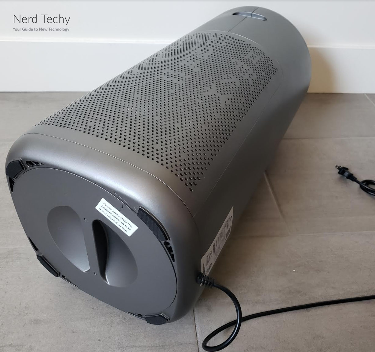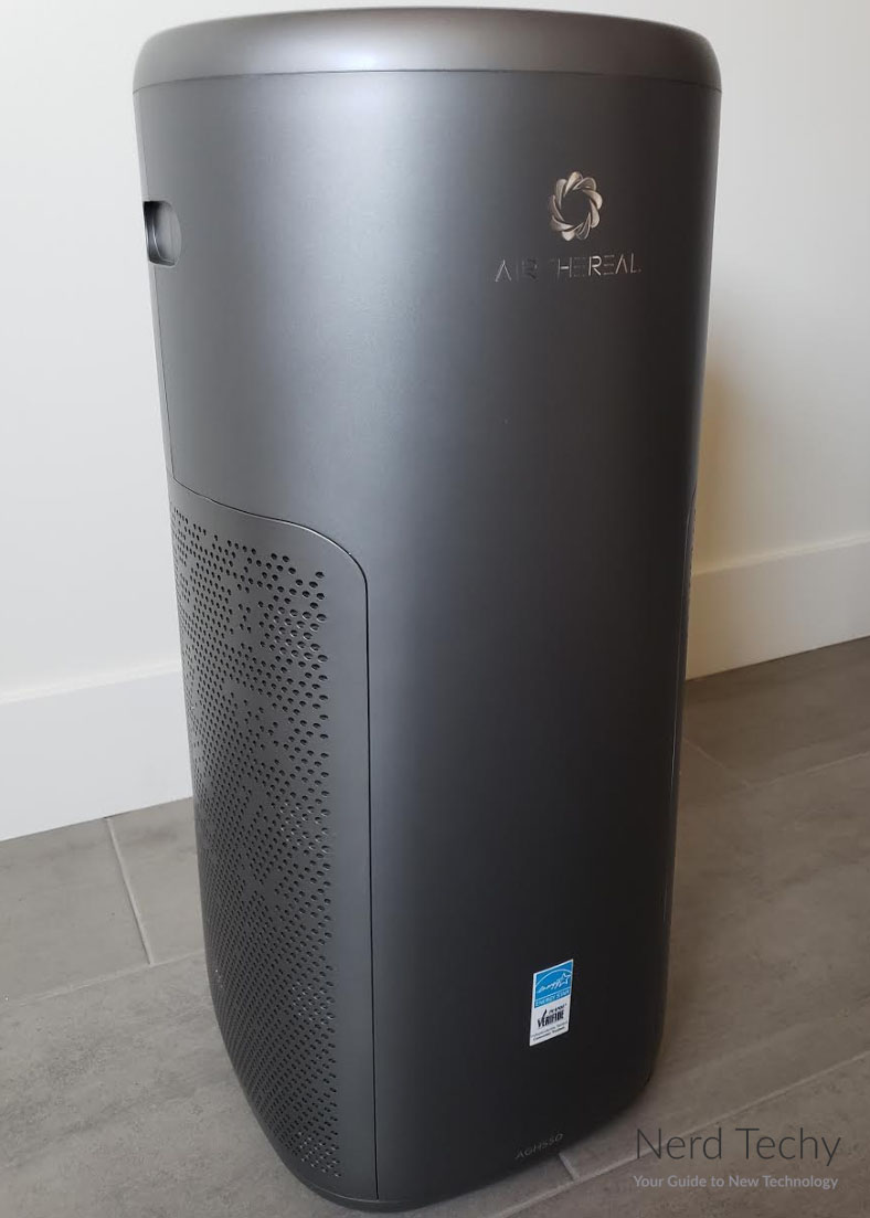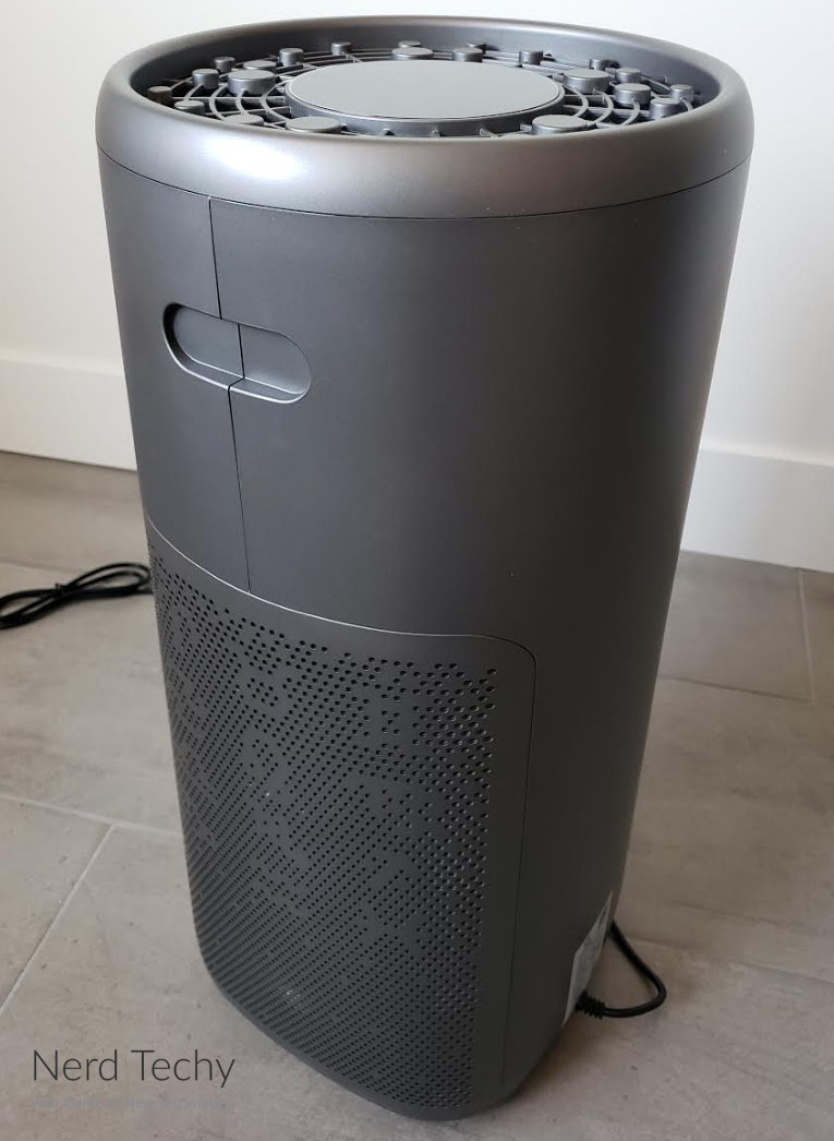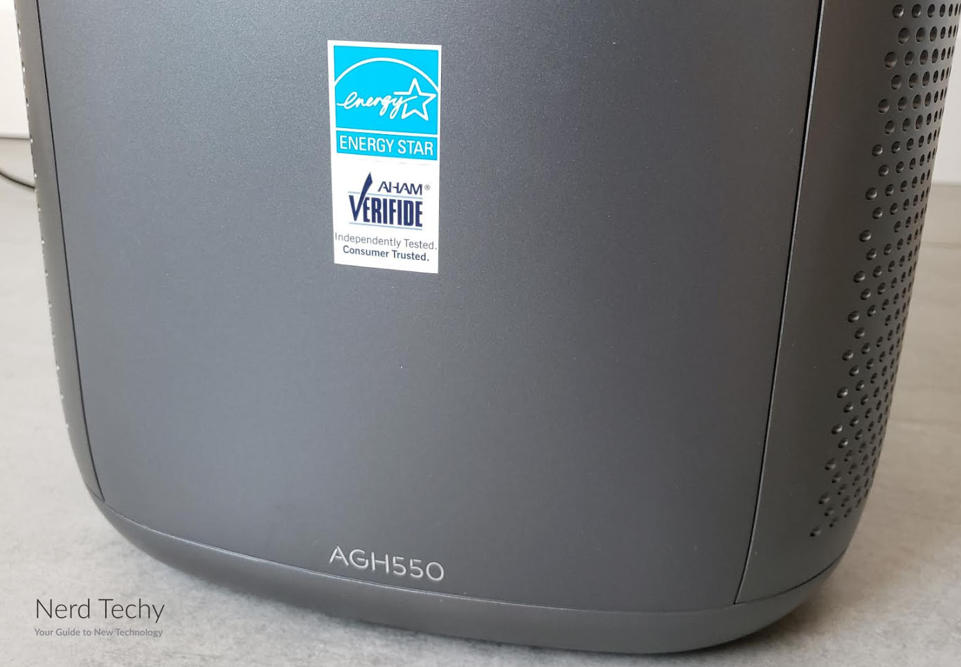 的airreal Glory Days AGH550是一个中等大小的空气过滤器,高24.6英寸,宽11.4英寸。它的底部是方形的,顶部逐渐变细,呈圆形。车身由哑光黑色ABS塑料构成,两侧的进风口用于空气流动。每边的顶部都有插槽,就在通风口上方,这使得Glory Days很容易携带。它重14.7磅,和你预期的大小差不多。有一个银色的airreal标志在前面,但它是一个相当低调的设计。
