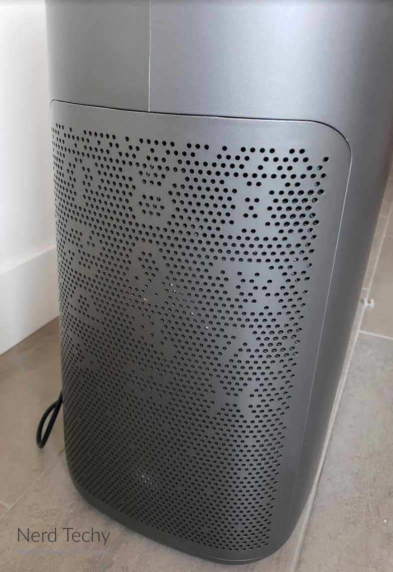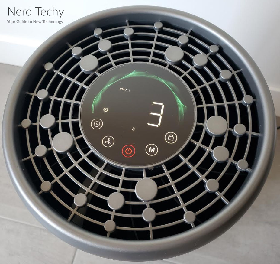 清洁空气通过设备顶部的圆形径向通风口流出。喷口上装饰着一系列不同大小的圆点,让它看起来像一个太阳系。在中间,有一个LED显示屏,显示计时器上剩余的时间。在自动模式下,显示器将简单地读取“auto”。顶部还有一个半圆形的LED指示灯,显示你的整体空气质量。它是绿色的,当你的空气质量好时,它就会呈现绿色。当你的空气质量是平均水平时,它会呈现橙色。当你的空气质量很差时,LED会显示红色,让你知道。