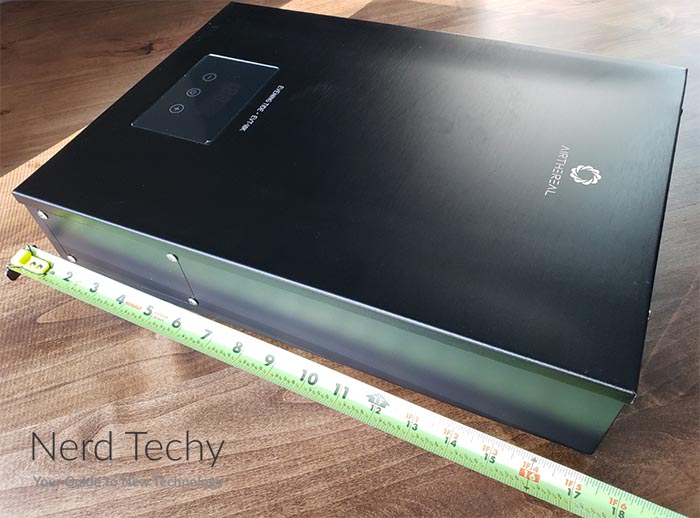 TheAirthereal Electric Tankless Water Heater有一个黑色的人造bru铝住房shed finish. This makes it corrosion-proof and durable, as well as easy to keep clean. It’s rectangular in profile, and measures 17.25 inches high, 12.22 inches wide, and 3.43 inches thick. It’s also surprisingly heavy for the size, tipping the scales at 18.74 pounds. This is because inside the plastic housing, there’s a lot of metal piping and parts. The back of the housing is also removable, which is useful if you need to perform any diagnostics. That said, for ordinary use, you shouldn’t have to access the inside of the unit. You should only have to open it up when you’re wiring it.