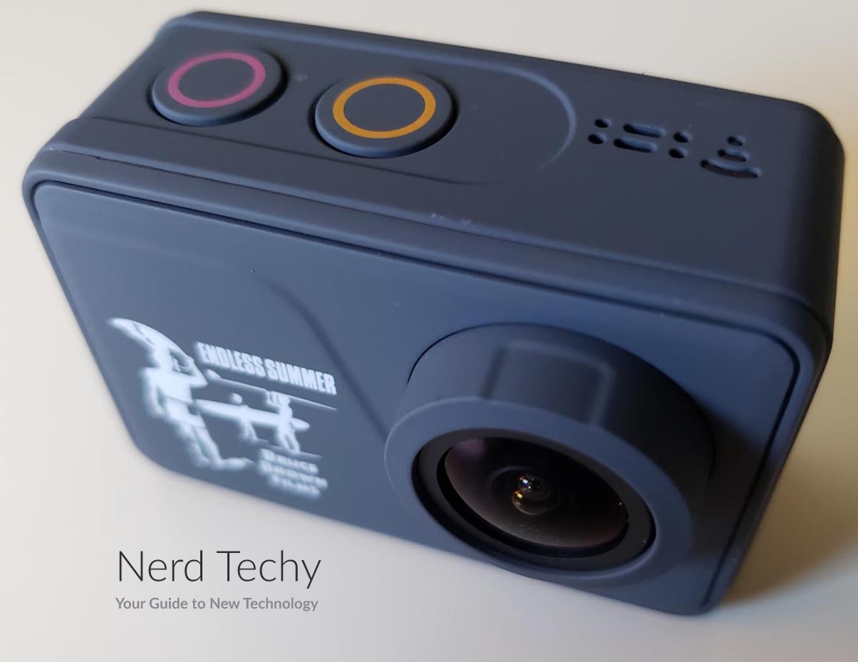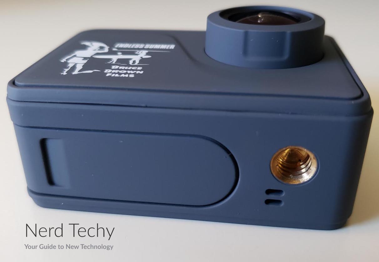 这个AKASO V50专业版是一个中型的动作相机,适合你的手。它的厚度大约是普通智能手机的三倍,而且有一点分量。外壳由坚固的黑色聚合物制成,边缘加固,具有抗冲击性。在正面,你会看到著名的冲浪纪录片《无尽的夏天》的白色电影海报。还有一个普通的,非限量版,只需少花几美元。但是如果你是一个冲浪爱好者,为什么不多花点钱买限量版呢。两种型号的镜头都在右下角的镜头外壳下方印有AKASO印记。镜头本身是普通的,具有宽轮廓,允许广角记录。