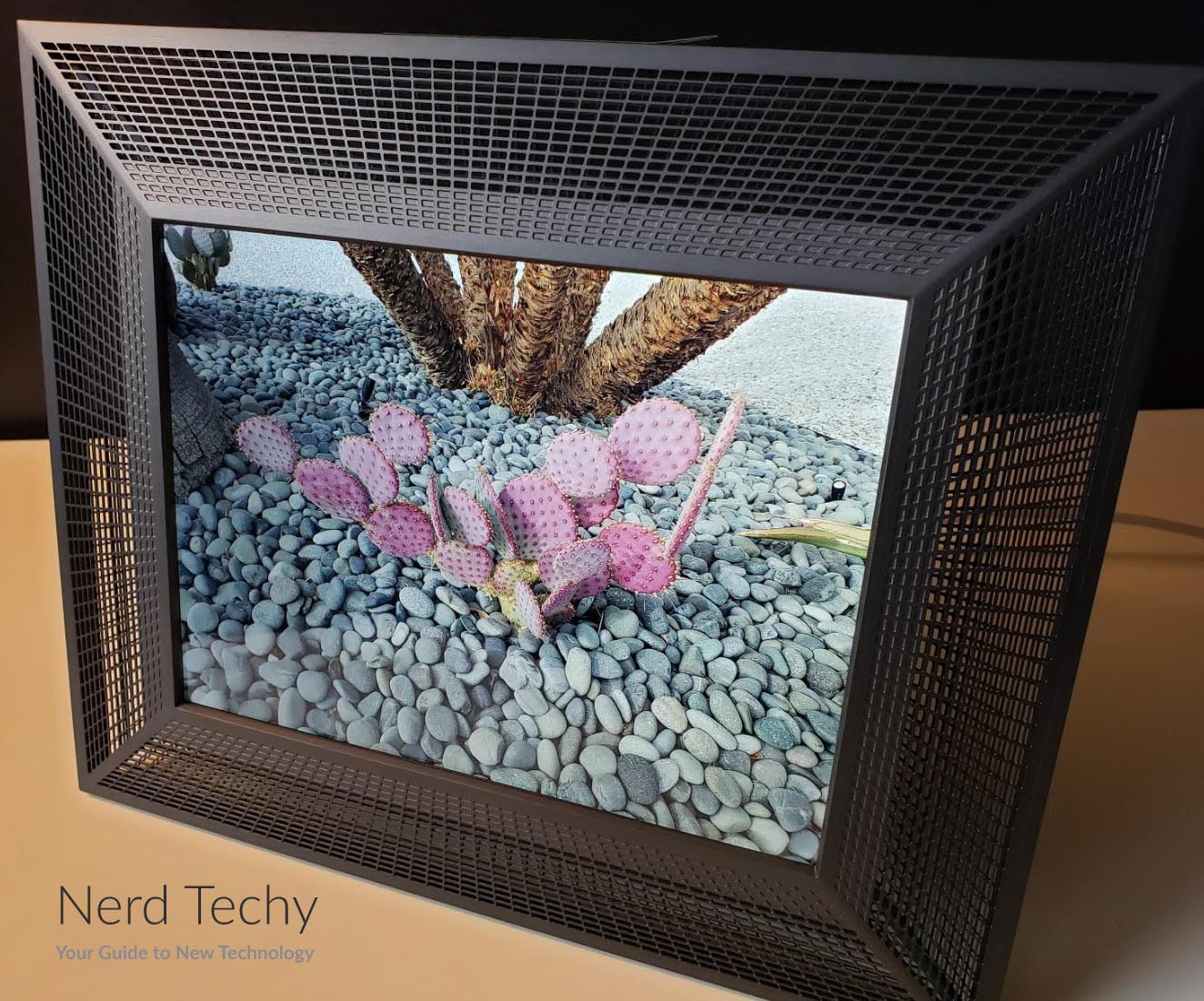 TheAura Frames “Smith”is a mid-sized picture frame designed for tabletop use. It measures 11.75 inches wide, 9.79 inches tall, and 1.02 inches thick. For portrait orientation, you can reverse those measurements. The screen itself has a 10-inch measurement on the diagonal, standard for wall photo prints. The frame has an elegant design, and is constructed from glossy plastic with a platinum rose metallic finish. The frame has a geometric design, with a pattern that forms a warped grid. It’s tough enough to take a little abuse, but take care with it as you would with a similar metal frame. It’s built for elegance, not durability.