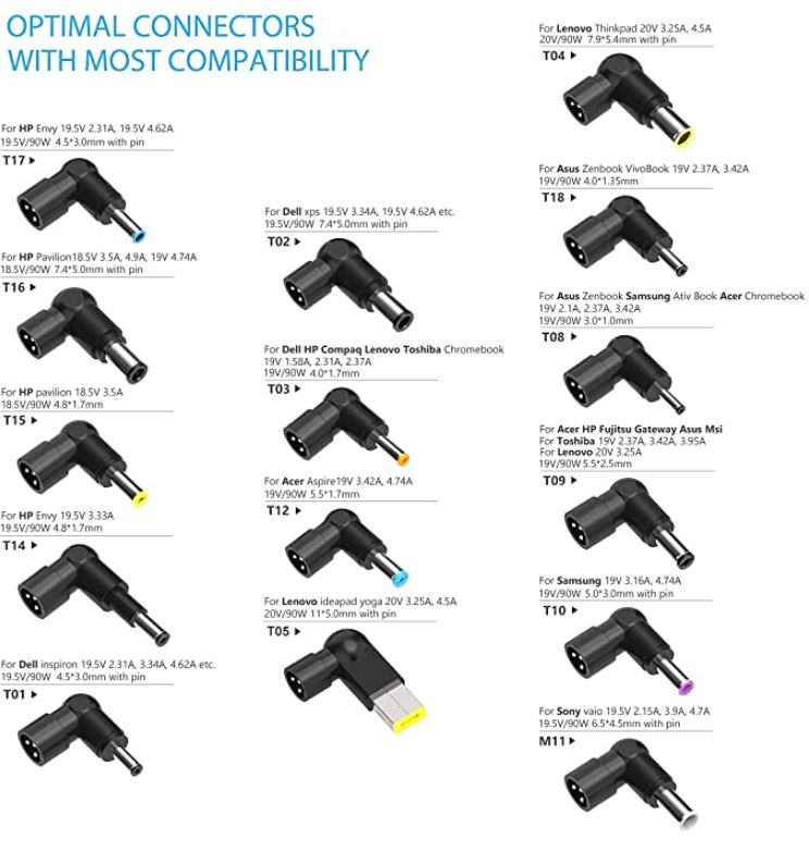 这similarities even extend to the number of tips. These include 16 different options, for a variety of brands. Among others, you can find tips for Acer, Asus, Compaq, Dell, HP, IBM, Lenovo, and Sony laptops. You’ll also find that all the tips attach with the same standard three-pin connector.