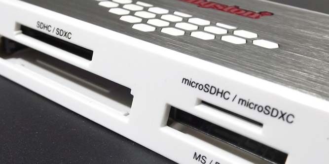 If you’re looking for a memory card reader that does it all,金斯敦的高速媒体读者是这一个。正面有四个用于不同类型的存储卡的插槽。前两个插槽是用于SD卡。它支持SDHC和SDXC,以及每个SDXC的微型品种。许多存储卡读取器仅给您一个插槽,并希望您保留使用微卡的适配器。多亏了移动革命,microSD卡比以往任何时候都更加受欢迎。由于大多数客户端将使用微型版本,因此不合理用户携带一个适配器,该适配器大约是其缩略图的大小来使用最受欢迎的存储卡格式。
