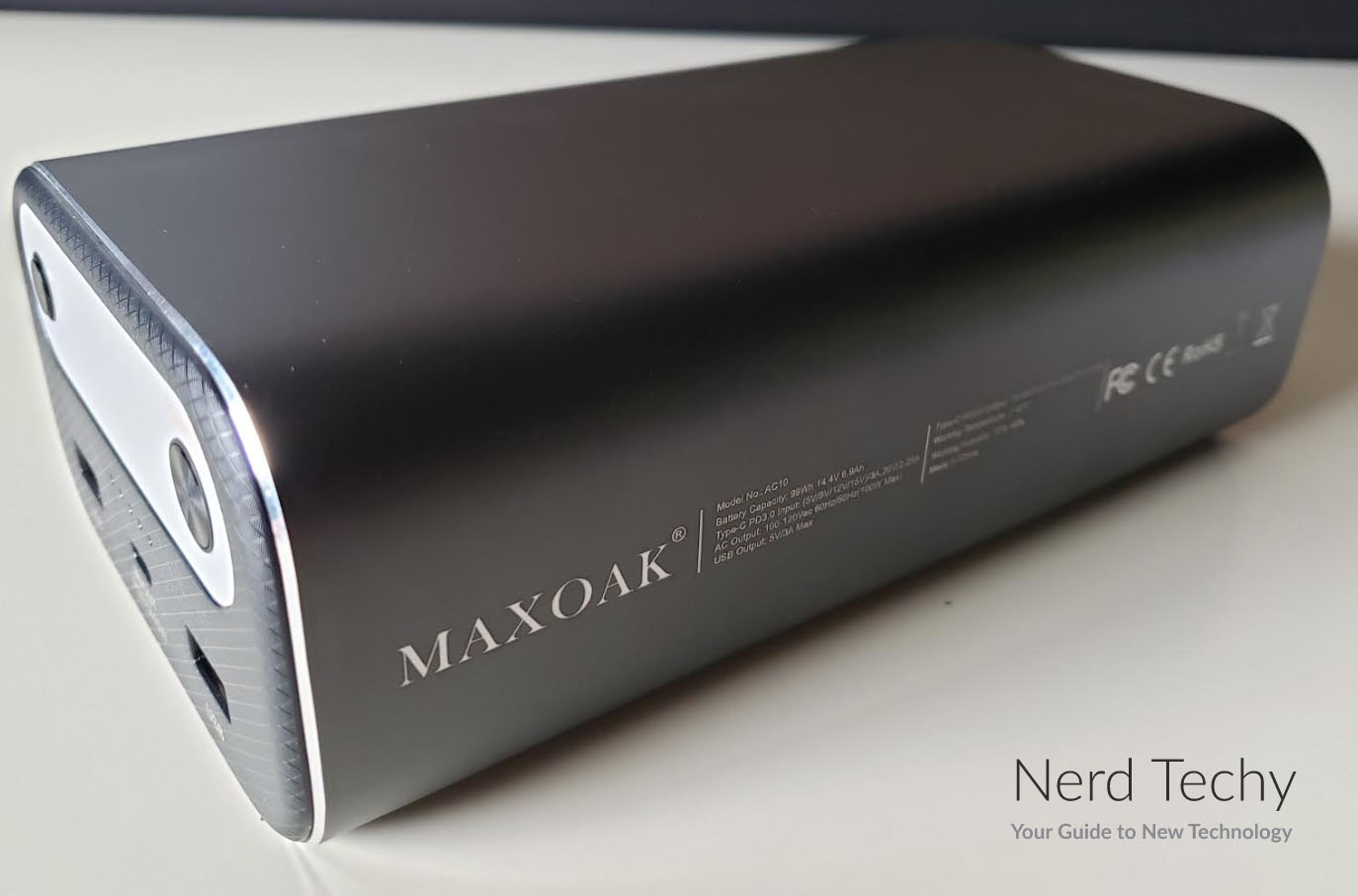 在设备的一侧,你会发现一个白色的MAXOAK标志,以及所有的设备规格。在前面,你会发现除了一个电源端口以外的所有端口。它有一对标准的USB Type-A接口,中间有一个USB Type-C接口。在设备的背面,你会发现一个3插头的交流端口,用于为非usb设备充电。这使得AC10比市场上几乎任何其他充电器都更多功能。前面和后面的单位都是通风,与网筛。这允许大量的空气流动,保持电力银行凉爽,即使在最苛刻的条件下。它还消除了冷却风扇的需要,所以你不必担心任何噪音在运行。