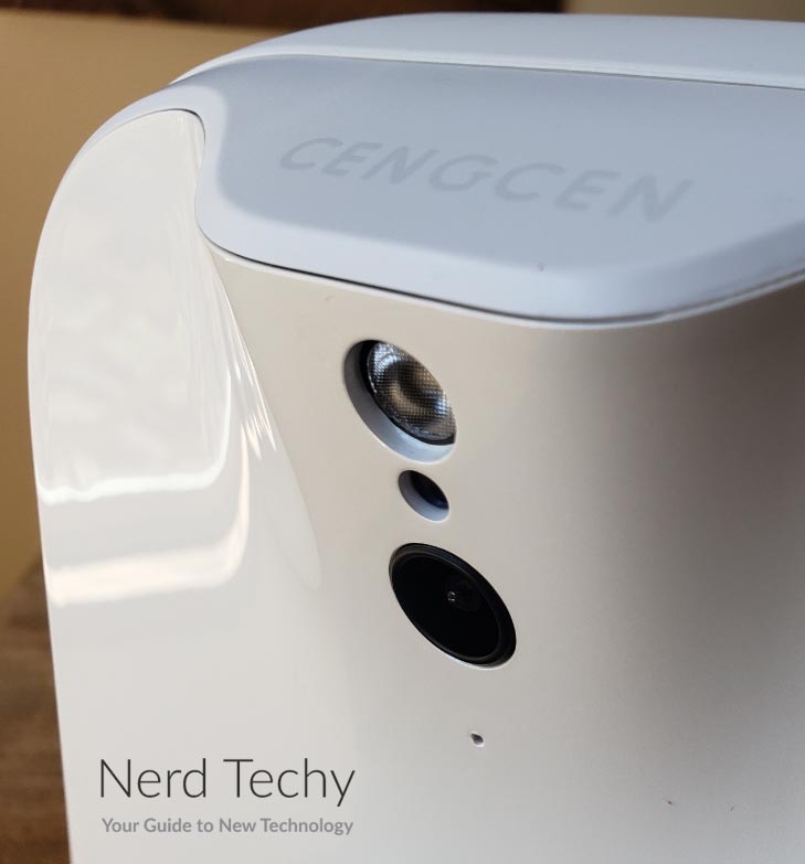 相机本身位于靠近外壳顶部的突出部分中。这将形成一个向下指向18度角的曲面。摄像头、运动传感器和红外灯泡都内置在该部件中。这既有吸引力又实用,并确保相机面向您的宠物。