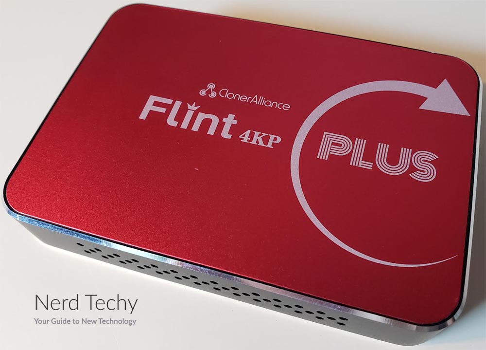 When we reviewed theoriginal Flint 4KP, we liked most of its features. However, the overall design, look, and configuration left us underwhelmed. Apparently, we weren’t alone, because ClonerAlliance has significantly overhauled the 4KP Plus’ design. Instead of the squarish, matte appearance of the old version, the new version has a slick rectangular design. The top plate is a satin red, with a white Flint 4KP logo emblazoned on it. The sides of the unit are black, similar to the original. However, they have a smoother look, with a slight outward bulge.