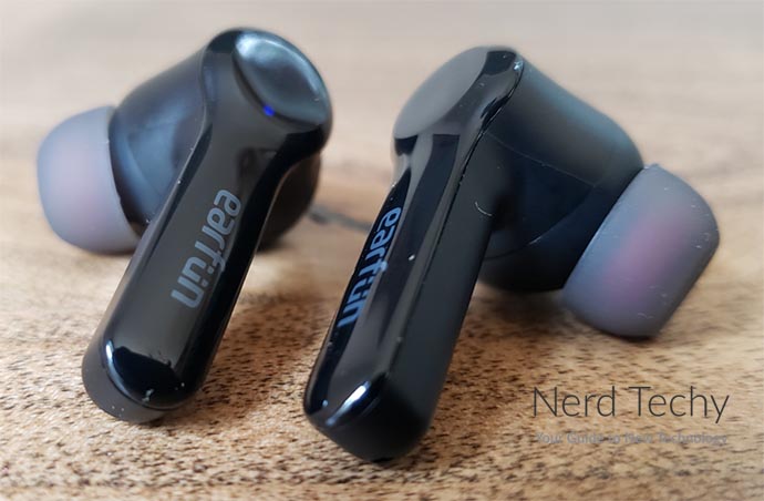 耳钉是黑色的,除了外部有一个灰色的“EarFun”字样。螺柱本身终止在平的,圆形背面的入耳壳。这些平面实际上是触摸控制,你可以用它来操作耳机。您可以调整音量,接听和结束电话,并播放或暂停您的音乐。此外,你可以打开手机的语音助手来控制更多的应用程序。