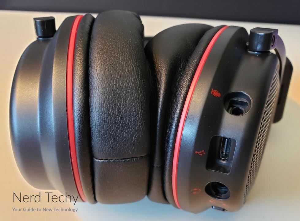 两个耳杯通过一根红色的螺旋线连接。这些电线可以弯曲和拉伸到一个显著的程度,进一步提高耐用性。右耳杯相对简单,只是一个扬声器的功能。大部分的动作位于左耳芽。在那里,你会发现一个音量拨号和静音按钮,可以调整你的音频设置。在这些端口下面,你会发现一个USB端口和3.1mm辅助端口,用于连接你的设备。最后,有一个小型专用插头可拆卸吊杆麦克风。如果你想把耳机当作简单的耳机使用,只要把麦克风拿开就可以了。这个麦克风有点硬,但它应该适合大多数用户。不过,如果能有更多的灵活性就好了。