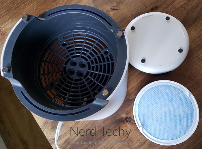 该净化器具有独特的型材,具有椭圆形切口,可通过外壳的底部透明。切口不仅仅是一个装饰特征。这是空气流入并被吸入过滤器的地方。因此,您希望保持畅通无阻,因此空气可以自由进入。流出通风口位于顶部,并在控制面板周围形成环。结果,清洁空气将以360度图案均匀地分布。但是,您还想保持该区域清除。如果阻止流出通风口,空气不会有效分发。