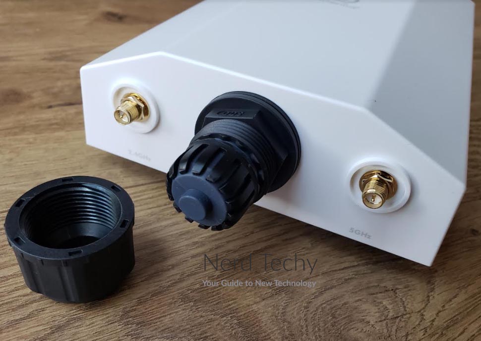 壳体的背面是灰色的,并且有四个安装孔和槽。螺钉包括在包装中,并且安装相当简单。决定要在哪里安装接入点,钻孔,插入螺钉,然后挂起来。它真的没有别的。在外壳的底部,你会看到一个小的黑色延伸。这是以太网电缆的连接,而且它是防水的。