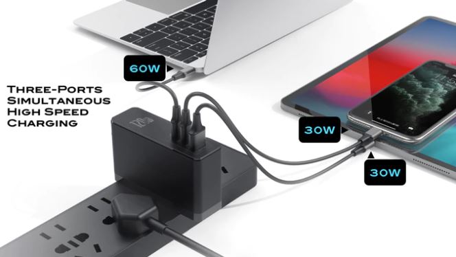 但如果你想同时给三个设备充电呢?没问题!最顶端的USB Type-C端口将提供60瓦,而其他两个端口将提供30瓦。这足以同时给笔记本电脑、平板电脑和智能手机充电。