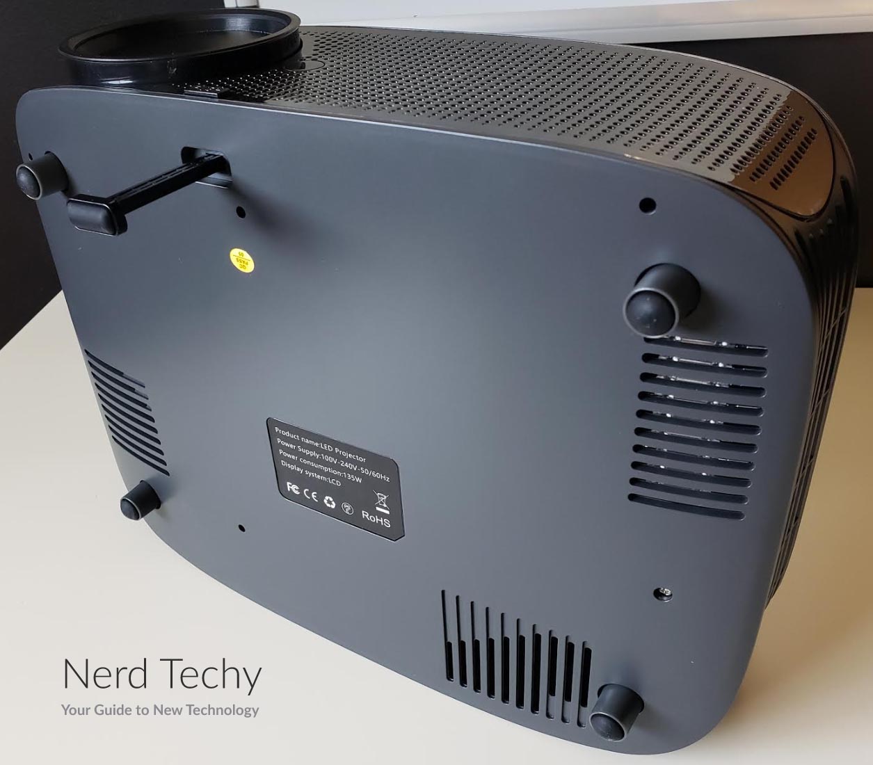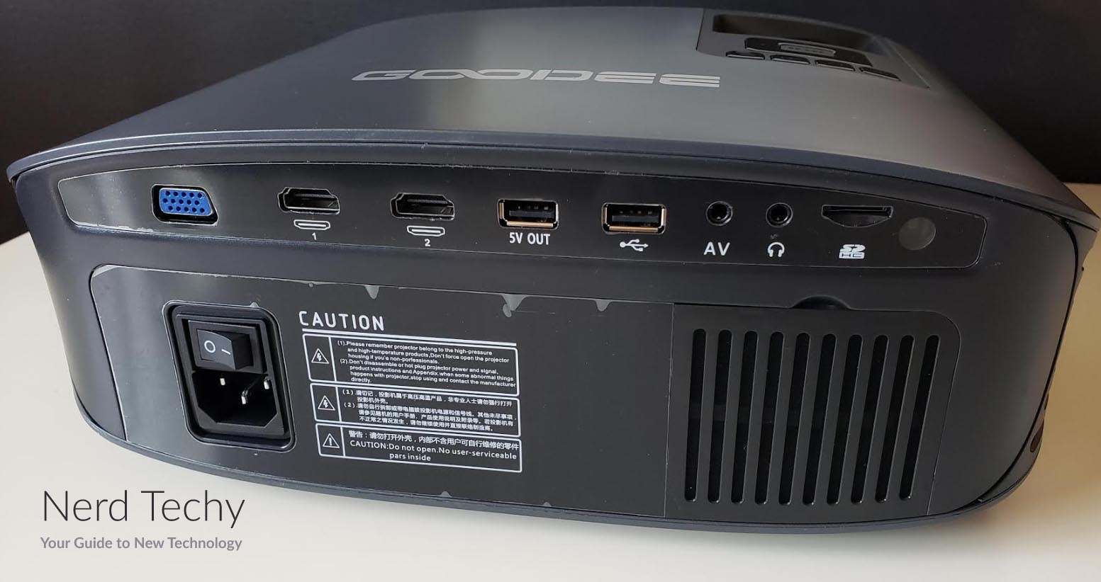 On the back of the projector, you’ll find all the video inputs. From left to right, there’s a VGA input and a pair of HDMI inputs. There’s a pair of USB ports, an AV port, a headphone jack, and even an SD card slot. Underneath, you’ll find the YG600’s power input, as well as an on/off switch.