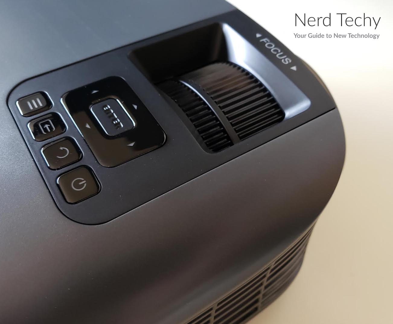 该表壳是由缎面塑料制成的,既易于清洁,也可以抵抗指纹。设备的顶部是光滑且拱形的,背面有一个灰色的Goodee徽标。在左前,您会发现控制面板以及镜头的基石调整表盘。控制面板具有电源按钮,一个倒带按钮,一个选择源的按钮和菜单按钮。其他四个按钮允许您浏览菜单。没有遥控器,因此您需要尽快熟悉控制面板。