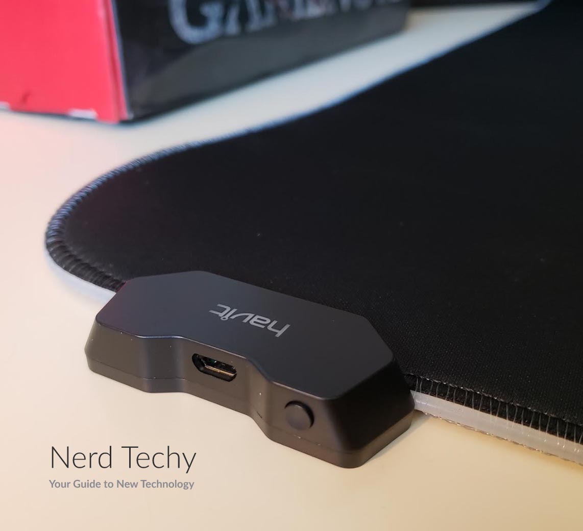 除了普通的鼠标垫基本功能外,Havit RGB游戏鼠标垫还具有LED照明功能。不用说,这种照明需要电源。鼠标垫的左侧有一个小型USB电源集线器。它从侧面突出,仅略微阻挡衬垫的左上角。它也是一种哑光黑色,因此它与衬垫本身的表面非常匹配。顶部有一个鲜红色的Havit标志。在外面,你会发现Micro USB端口本身,还有一个控制LED的按钮。