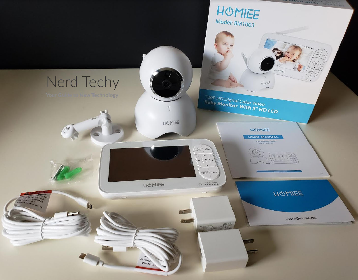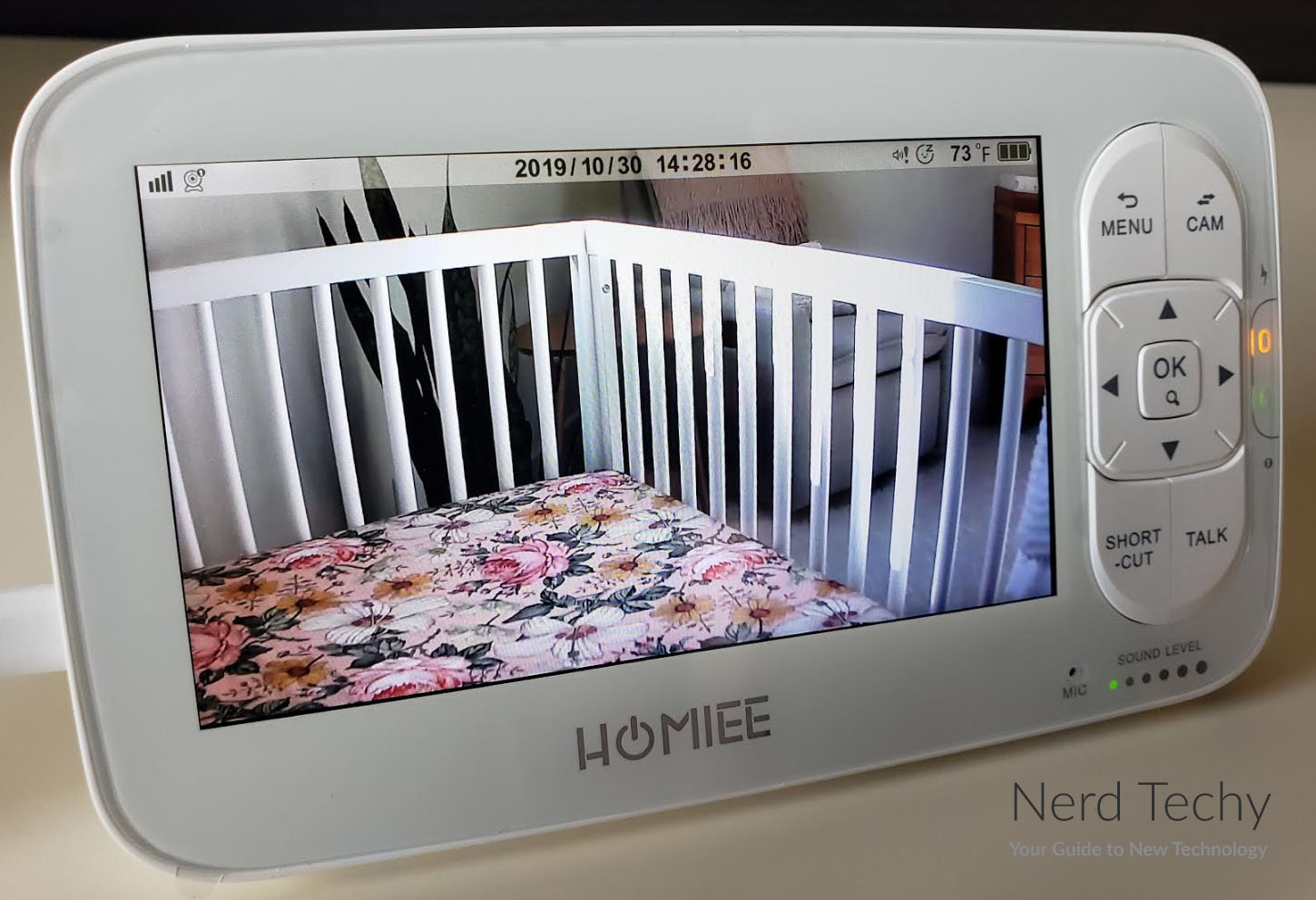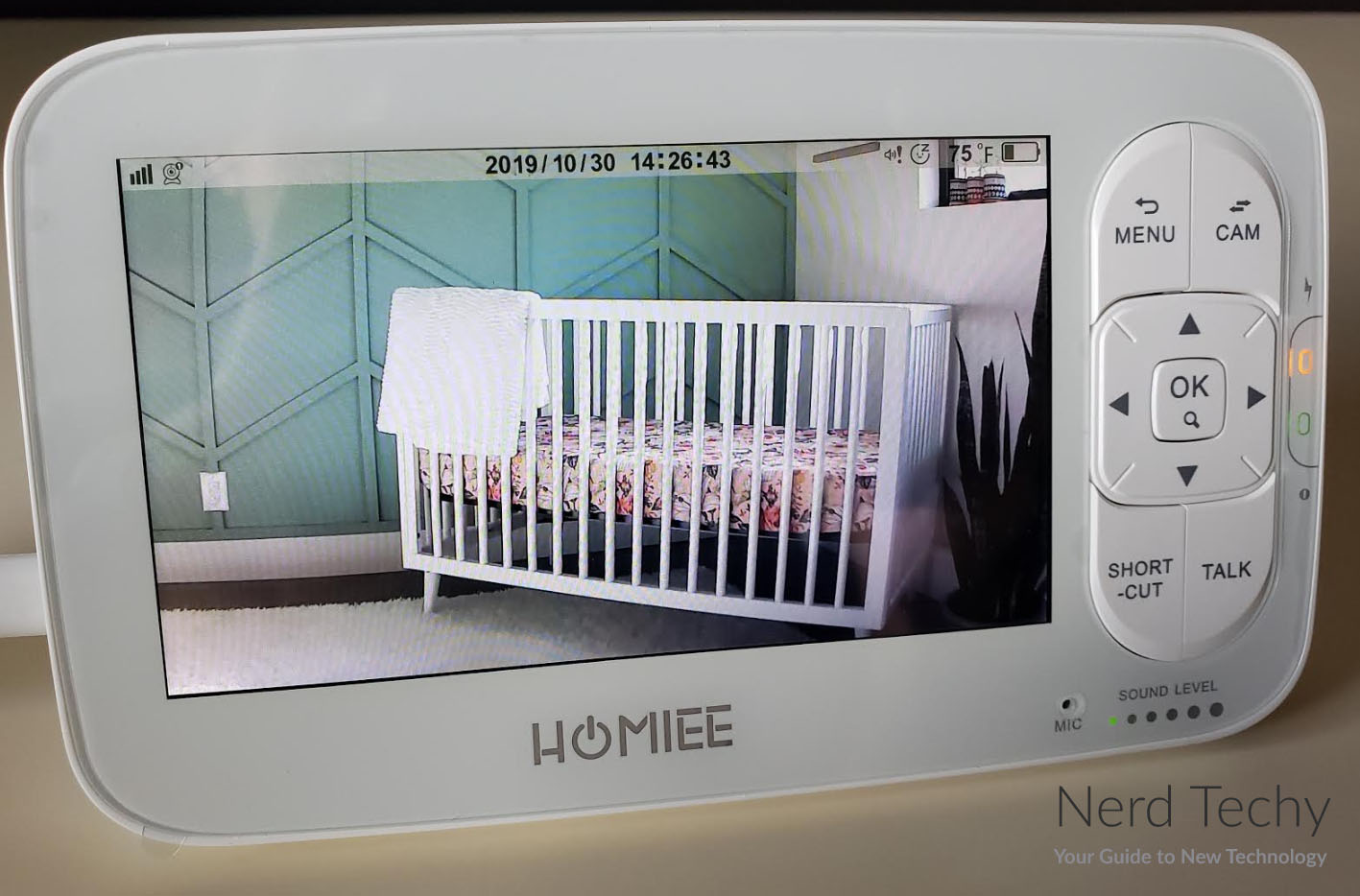 显示器的前部有一个5英寸的液晶显示屏,提供720p的图像。这不是1080p,但这应该不是一个重要的问题。在这种尺寸下,720p和1080p基本上没有区别。你的眼睛都看不出来。在显示器下面,有一个灰色的HOMIEE标志,与相机上的标志相匹配。在显示器的右边,有一个控制面板。这些按钮允许您控制我们稍后将讨论的所有功能。该菜单有一个简单、易于导航的界面,任何人都能理解。在按钮下方,还有一个声级指示器,以及一个麦克风孔。显示器和相机都有12个月的制造商保修。 Any manufacturer’s defects will be a non-impact.