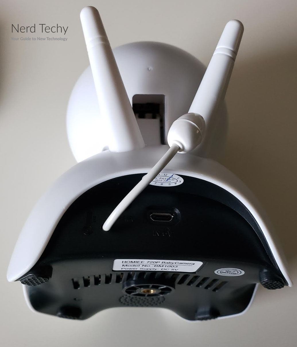 球形相机安装在一个宽大的三脚架式底座上。它的总高度刚刚超过4英寸,基宽约为3英寸。它由ABS塑料制成,带有哑光白色表面,对眼睛很容易,也很容易清洗。在底座的前面,有一个灰色的HOMIEE标志,上面有一对小麦克风孔。在背面,有一个小型无线电天线,可以旋转得到更好的信号。在天线下面,有一个小的鸡蛋形状的温度计链,它也是灵活的。