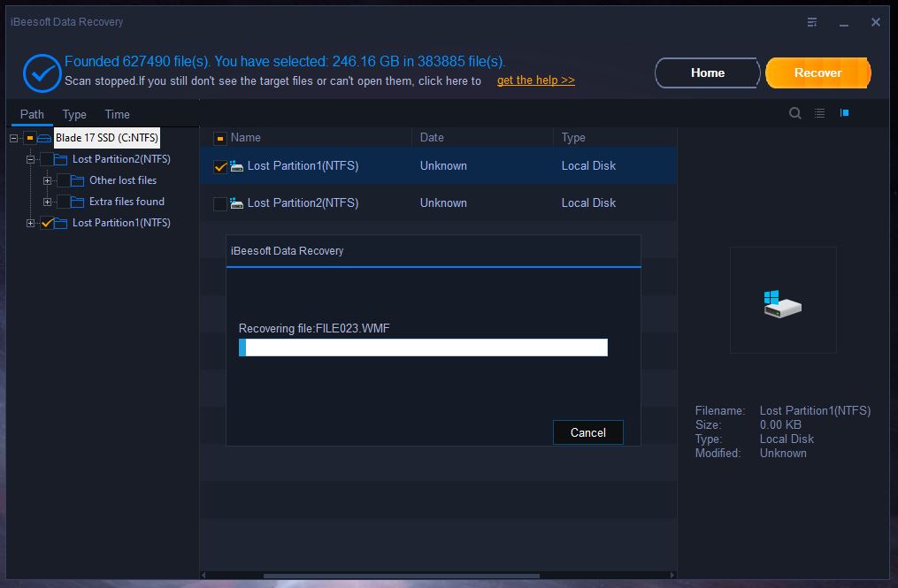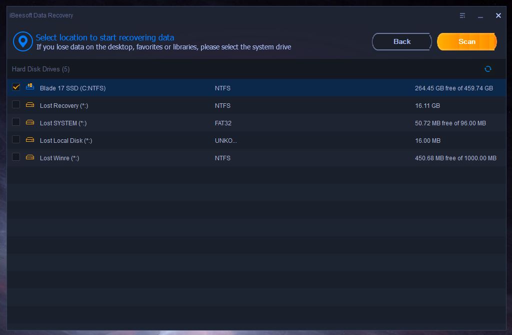 如果您处理的是一个非常大的驱动器,那么进一步限制您的搜索条件会很有帮助。使用iBeesoft,您可以选择一个特定的分区,甚至一个特定的文件夹。这可以帮助整理辅助的、不需要的结果。但是请记住,它也会使您的数据更难找到。在这种情况下,你需要搜索整个硬盘。