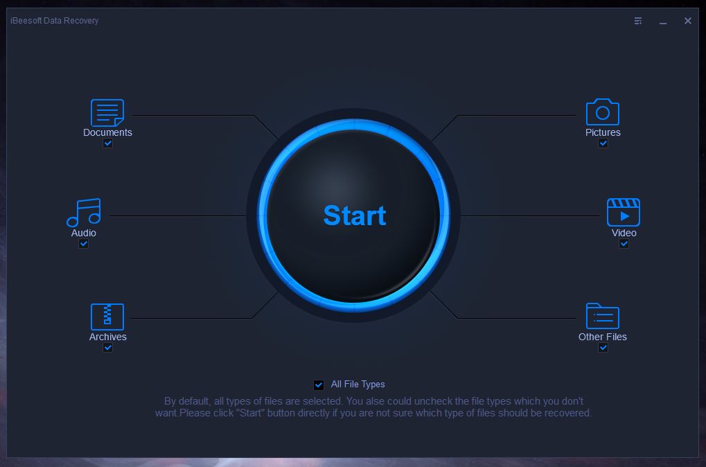 当您第一次启动iBeesoft数据恢复时,您将看到一个简单的菜单,允许您选择不同的文件类型。缺省情况下,选择所有文件类型。如果您以这种模式运行软件,它将尝试恢复所有文件。如果您明确地知道要查找什么,那么您可以只检查特定的文件类型。这可以显著提高恢复的速度。搜索完成后,您将看到一个可恢复文件列表。只需点击“开始”开始恢复它们,或者先取消选中不需要的文件。