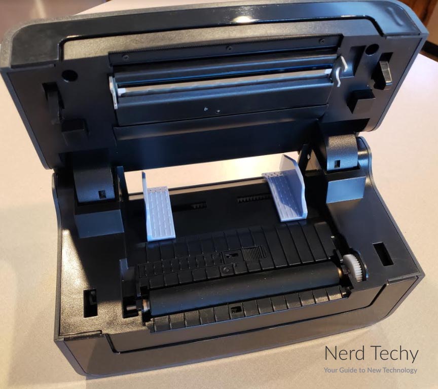 在外壳的两边,你会看到一对蓝色的开关。这些可以向前切换,以释放机器的顶部。它会从后面折开,在前面留下一个大的开口。打开打印机可以很容易地开始给一个新的标签,以及移除任何卡住的东西。它对清洁也很重要。打印头会不时地变脏,需要清洗。要做到这一点,你只需用棉签或布蘸一些外用酒精。头就在外壳的前面,所以它们很容易在打印机打开的时候到达。