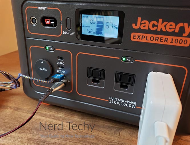 在显示屏的左侧,您会发现一对输入,用于为电源组充电。左边的是交流充电器和直流车载电缆,两者都包括在内。右边的那个是太阳能,包里有一根连接电缆。这使得从各种来源为电池充电变得容易。显示屏右侧还有一个明亮的橙色Jackery印记。