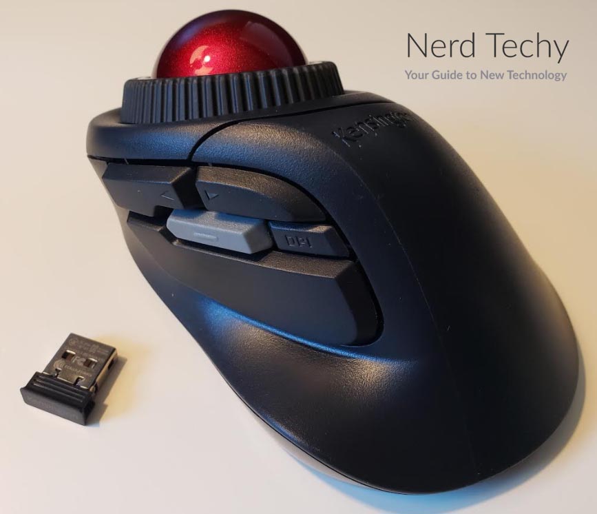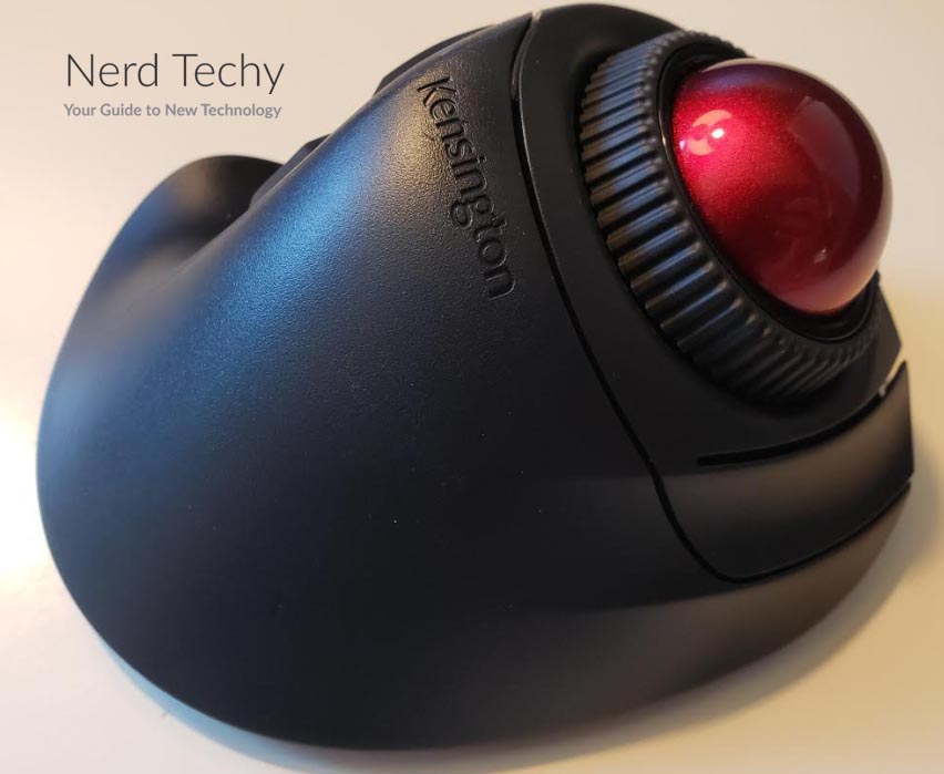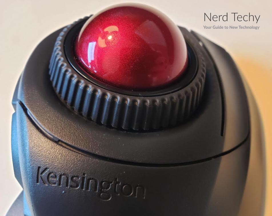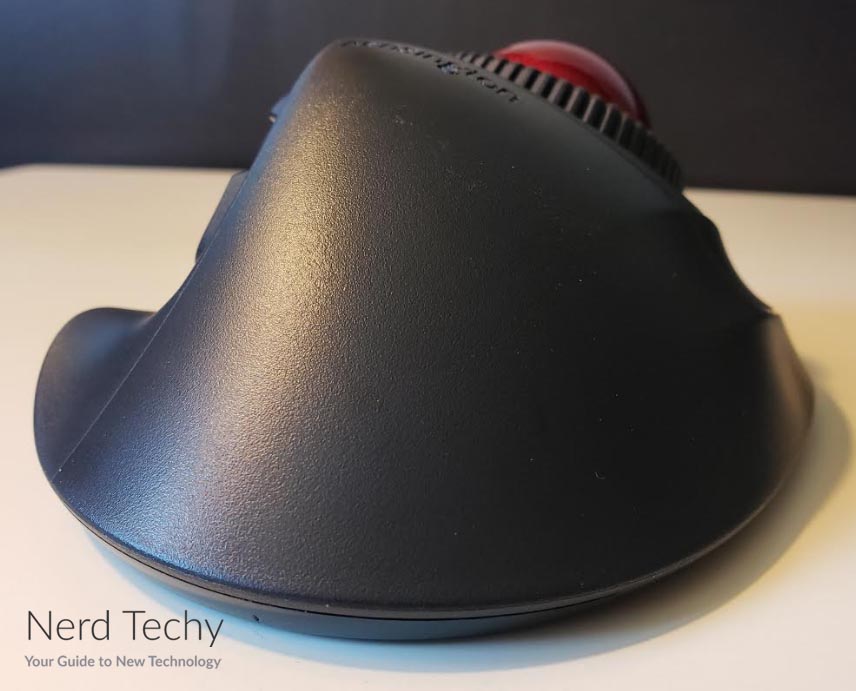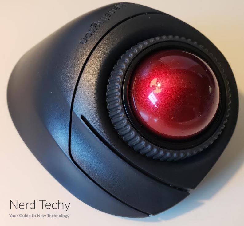 鼠标壳体由缎面ABS塑料构成,易于清洁,不会粘在汗水中。整个外壳是黑色的,即使是顶部的小肯辛顿标志,也只是压印进入表面。唯一的颜色飞溅是轨迹球,这是一个明亮,光泽的红色。饰面完全光滑,无论如何都没有任何变化。黑色组合上的红色是专业的外观,适合家庭和办公室使用。