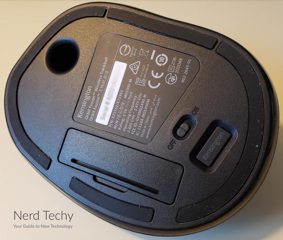 轨迹球的直径为40毫米,也就是1.5英寸多一点。这使得它相当大,比许多轨迹球大得多。在球的下面,一个精密的激光跟踪球的运动。里面还有一个喷射柱塞。如果你把轨道聚变翻过来,你会看到一个小金属片。按下该选项卡,轨迹球将弹出。当它不可避免地需要清洗时,这使得它很容易被清除。此外,外壳的底部还设有电池室和无线接收器的存储槽。