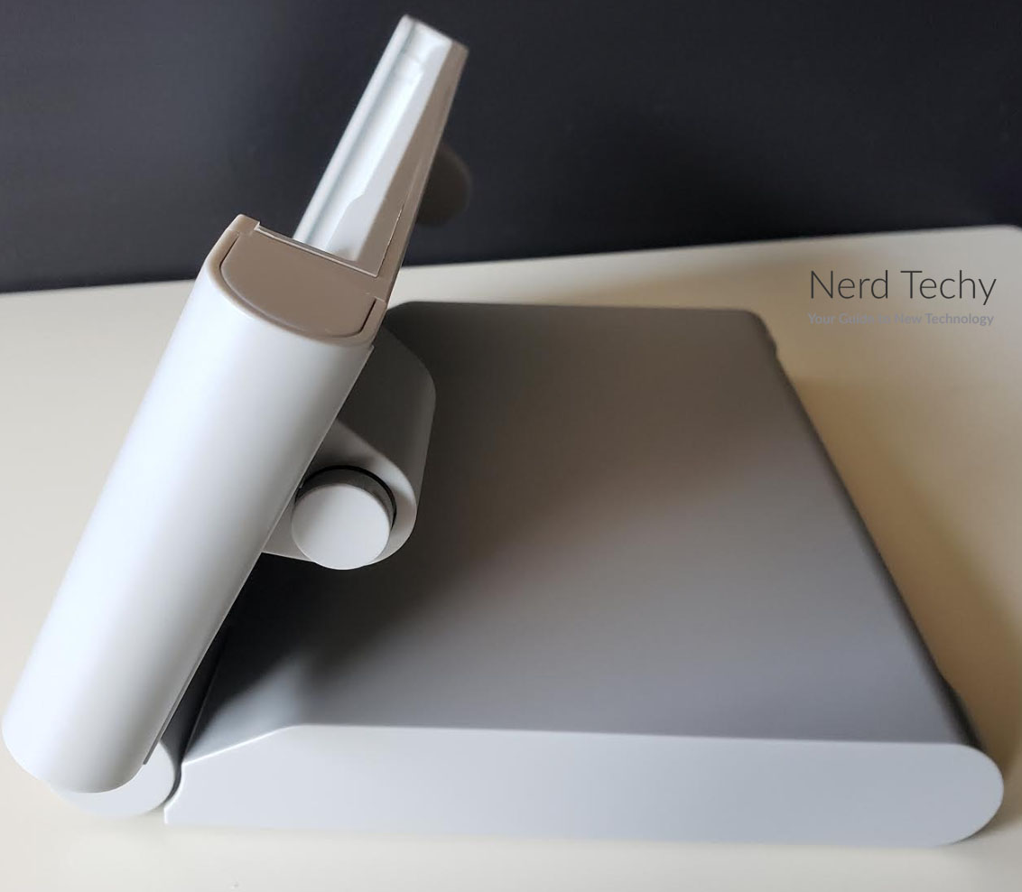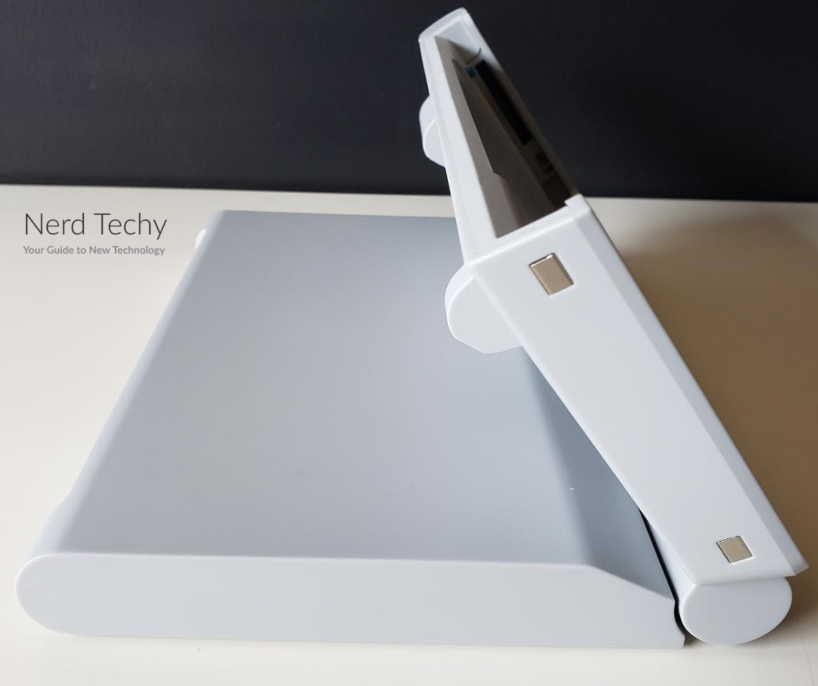 TheSD6000is constructed from light gray ABS plastic, with polycarbonate reinforcement at the hinge and other high-stress areas. The base measures 9.2 inches in width, 6 inches in depth, and 1 inch in height when it’s folded up. The hinge at the base allows you to adjust your tablet to any angle. As a result, you can use it at a variety of heights. There are a pair of rubber-padded clamps on the front that hold your tablet securely without scratching the case. When your tablet is inserted, the clamps will extend to a width of 12 inches. On the left side, you’ll find a small magnetic mount for your Surface Go pen.