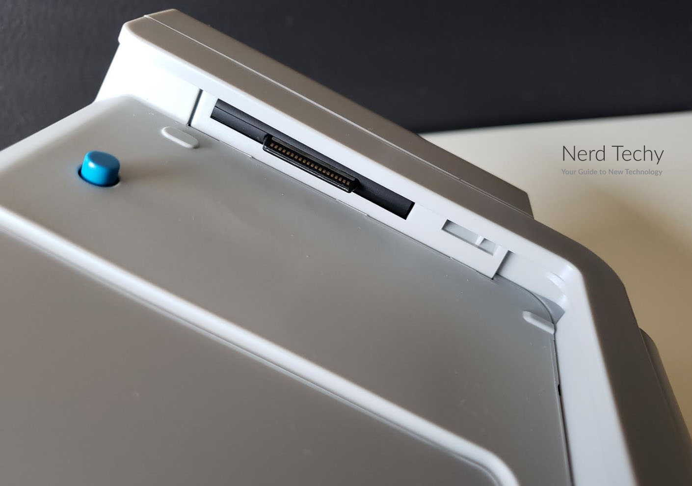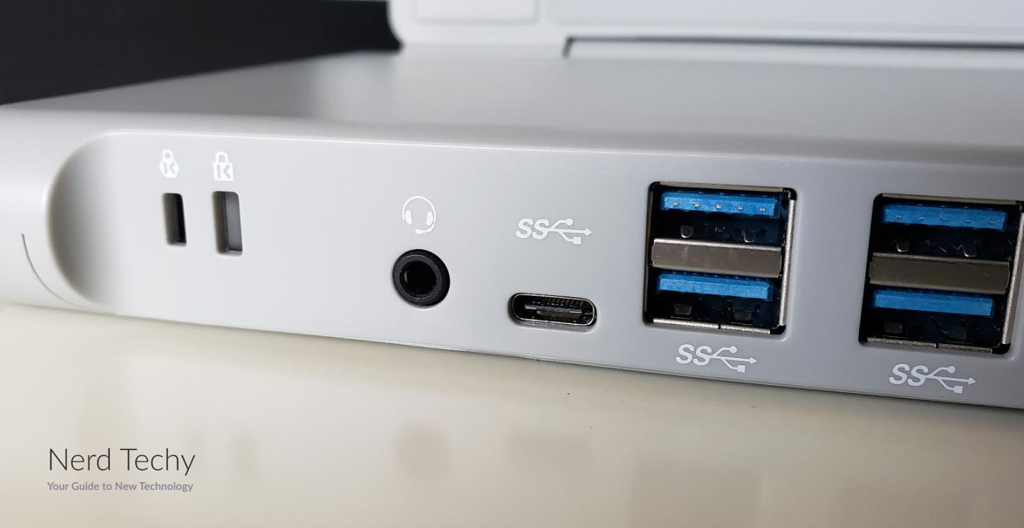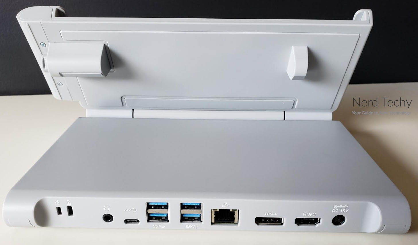 Moving along to the left, you’ll find a Gigabit Ethernet port. This port is fairly self explanatory, and may not be necessary. After all, you could just use the Surface Go’s native WiFi capability. But if you don’t have a WiFi signal, it ensures that you’ll still be able to get online. You’ll also find four USB ports for connecting all of your peripherals. These are full-powered 5-volt jacks, so you can connect any device you’d use with a desktop PC. They only provide 0.9 amps of current, though, so you won’t be able to use quick charge mode. There is, however, a USB Type-C jack that provides a 5-volt, 3-amp current. If you want to quick charge your smart phone, use this port, and your battery will be full in no time.
