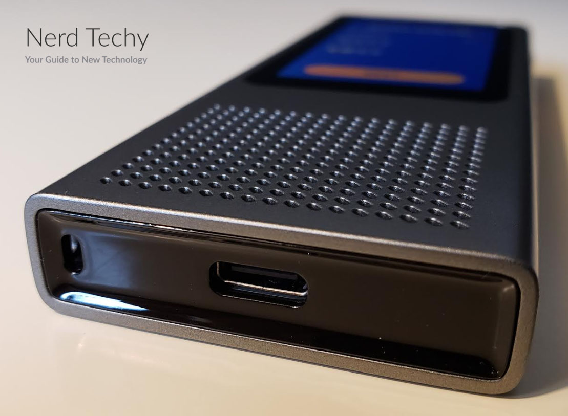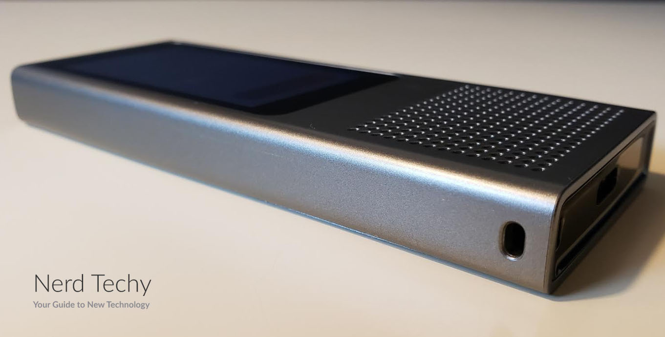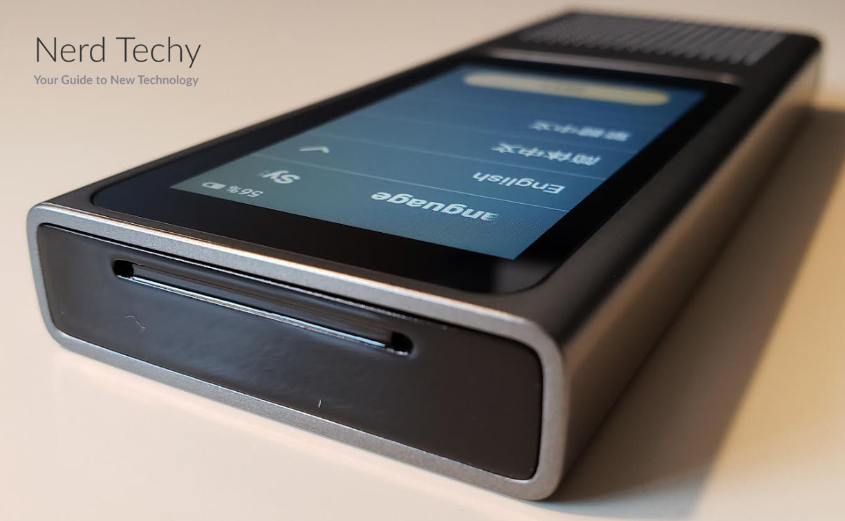 乍一看,Langogo Minutes就像一个老式的袖珍录音机。它长4.5英寸,宽1.8英寸,厚半英寸。它的重量不到3盎司,相对较轻。它有一个灰色的ABS塑料外壳,在左上方有一个小麦克风槽。前面板的底部三分之一被扬声器占据,可以进行即时播放。机身前部的上部没有采用卡式磁带座,而是内置了2.45英寸的触摸屏。显示屏有一个黑暗的主题,这提高了电池寿命,大的,易于阅读的图标有足够的可视性。