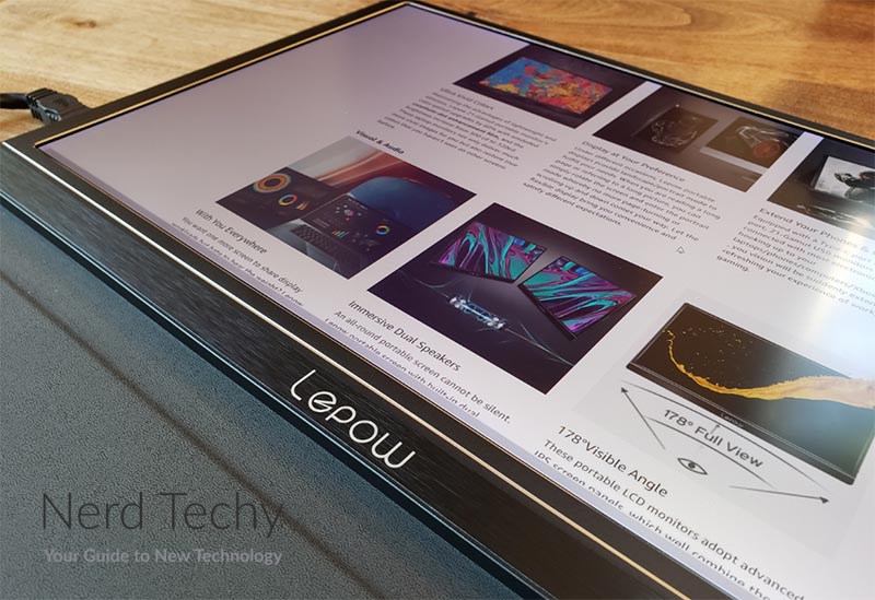 这个Lepow Z1色域是一款折叠显示器,可折叠至14.2英寸宽、8.8英寸高、0.34英寸厚。我们应该清楚地听到我们所说的“折叠”和“崩溃”是什么意思。屏幕本身是硬的。然而,箱子向后折叠,作为支架。这意味着两件事。首先,由于它的折叠方式,屏幕的角度很容易调整。只需向前或向后滑动底部即可倾斜。类似地,要在横向模式中使用,您只需将其侧转即可。其次,你不必为你的屏幕单独携带一个箱子。整个东西的重量只有1.7磅,比大多数笔记本电脑要轻得多。因此,如果你把它放在电脑旁边的笔记本电脑包里,你几乎不会注意到它在那里。