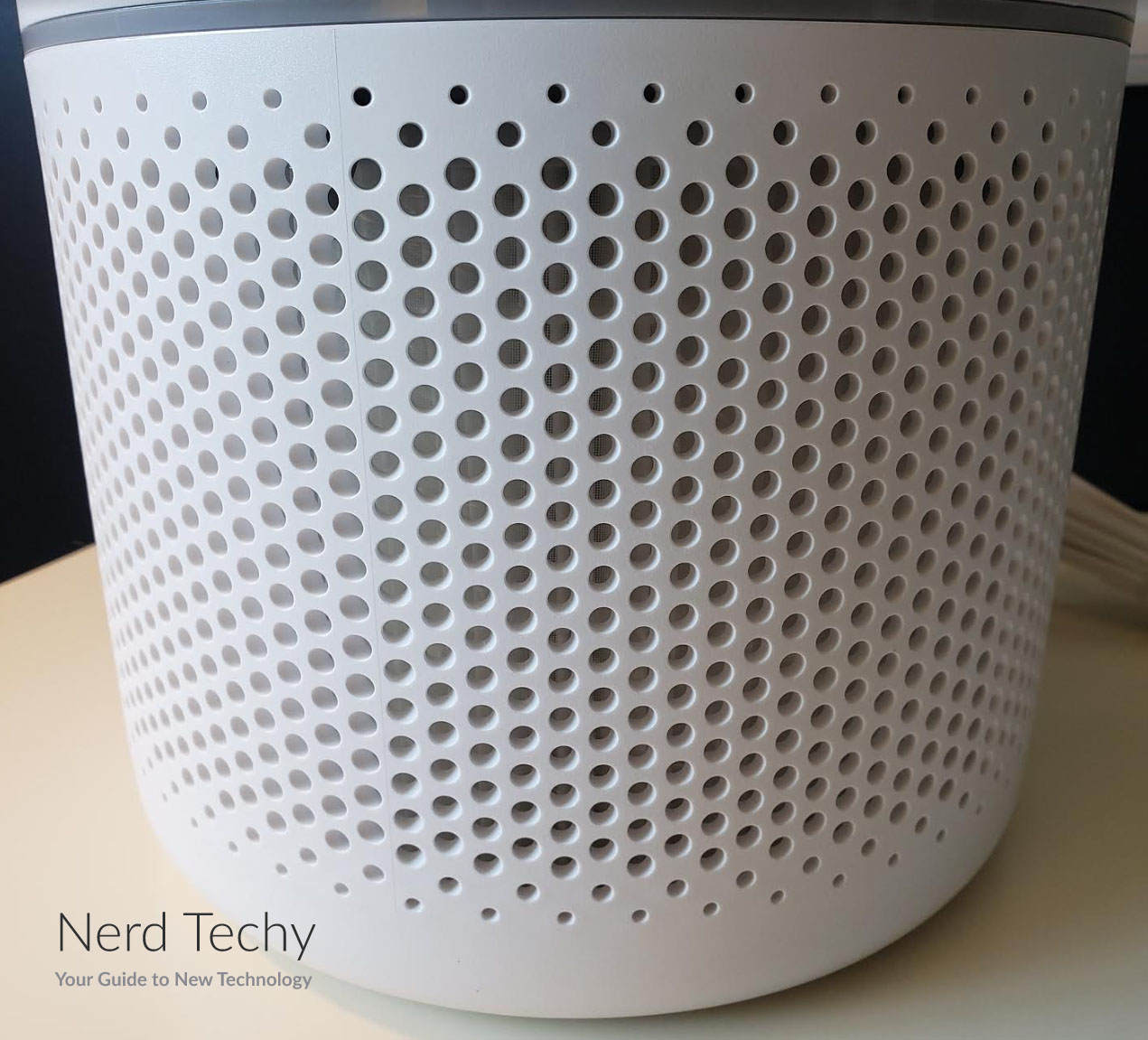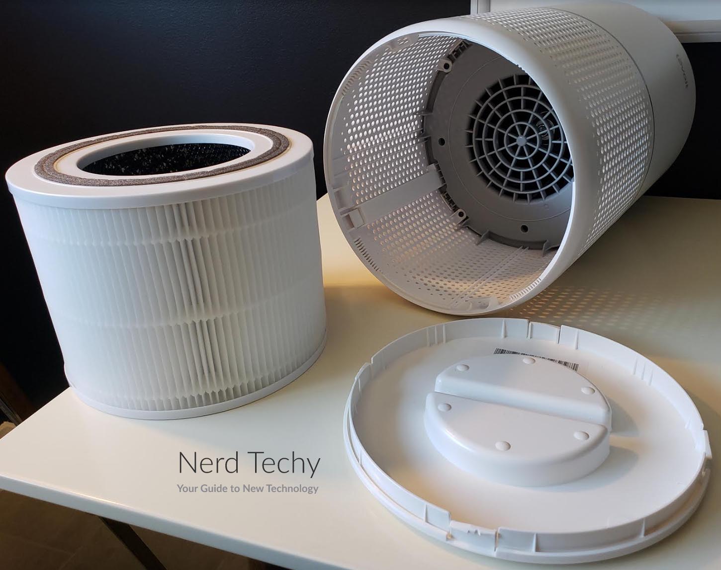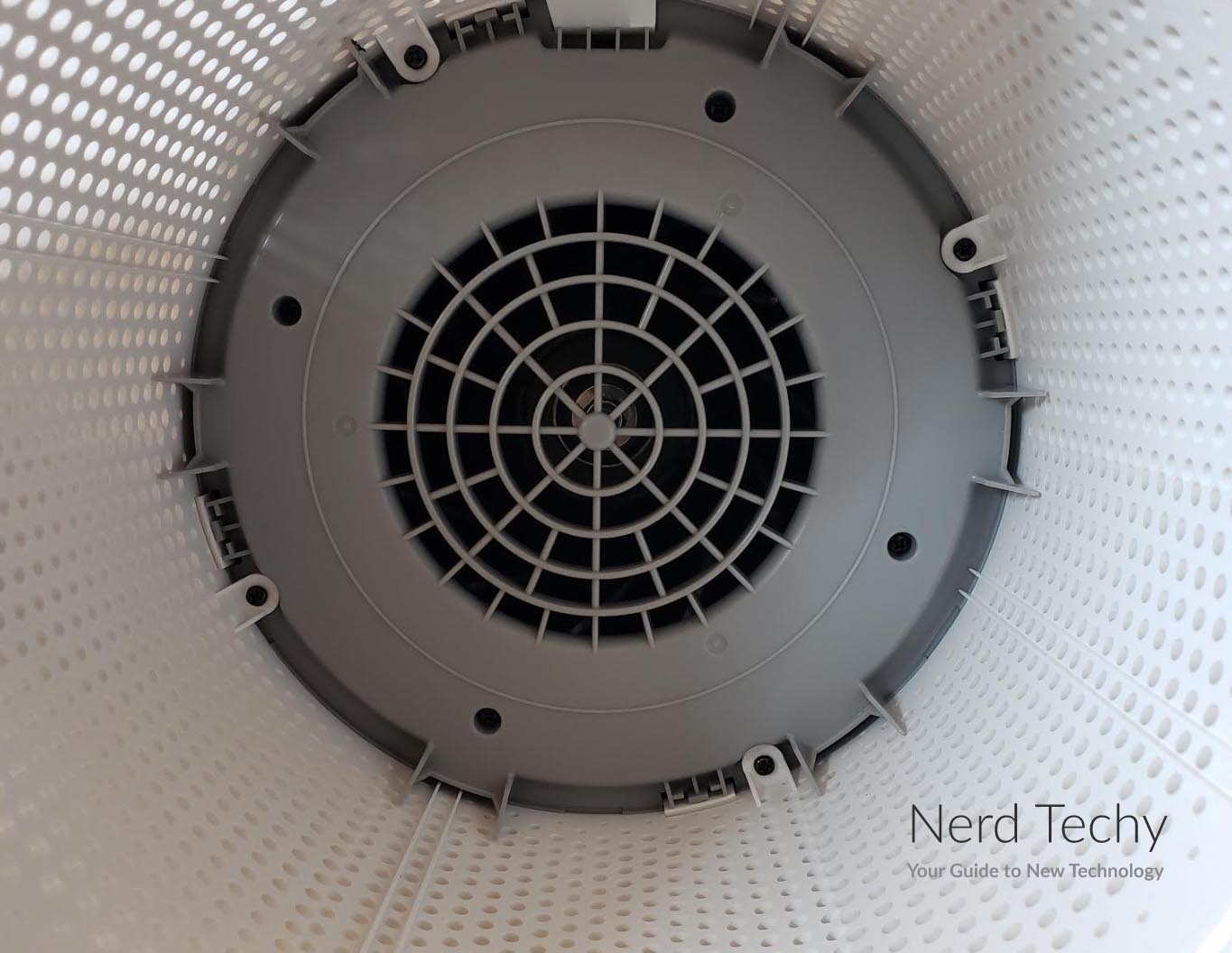 该单元的下半部分装有过滤器。它的外部有一个简单的网格穿孔,允许大量的空气流动。因为它能360度全方位吸入空气,所以当四周畅通无阻时,它的表现最佳。如果它靠墙放置,你会注意到性能下降。在这部分上面是一个灰色的带,标志着外壳可以拧开的地方。这样可以很容易地取下顶部,并根据需要更改过滤器。