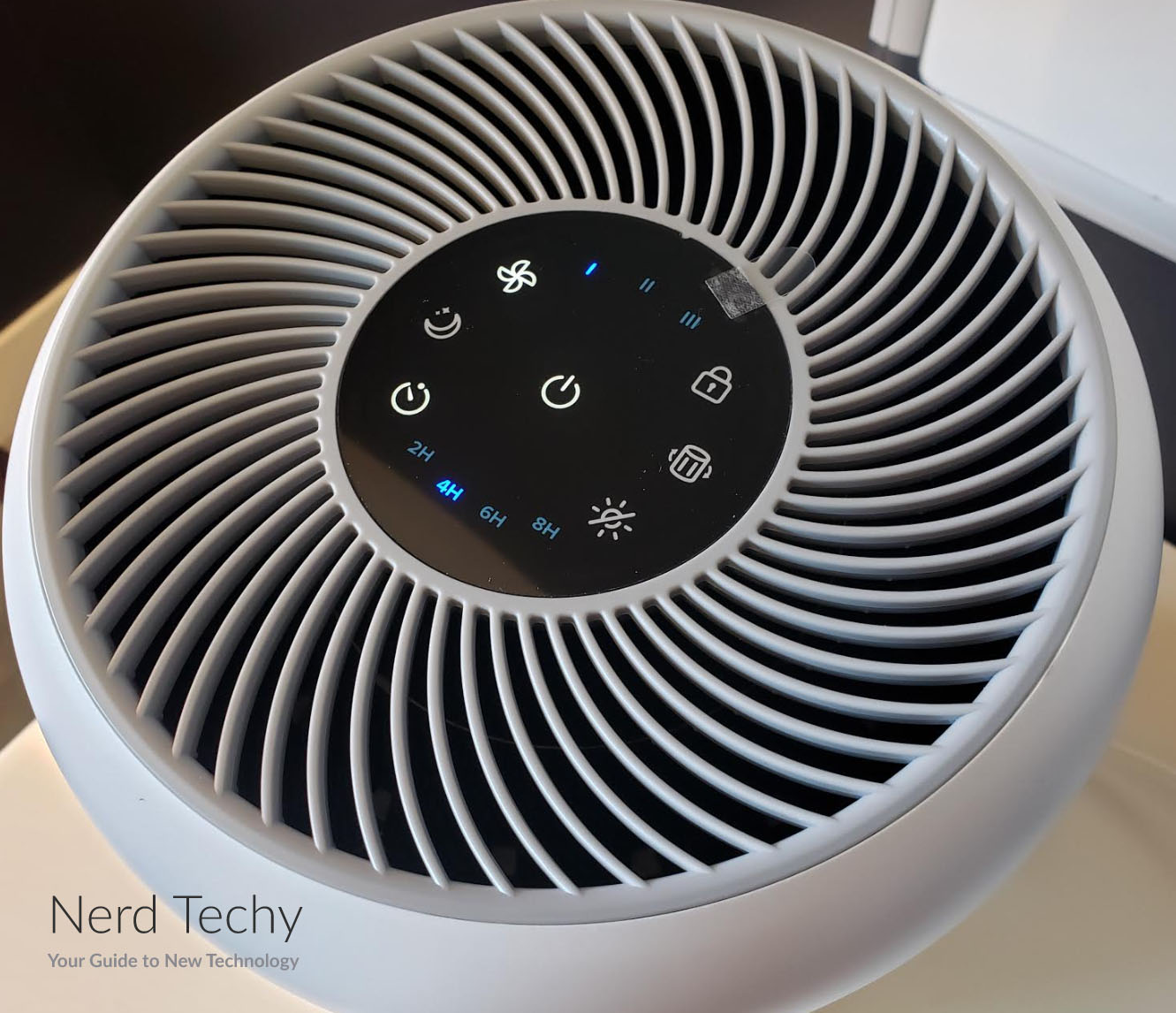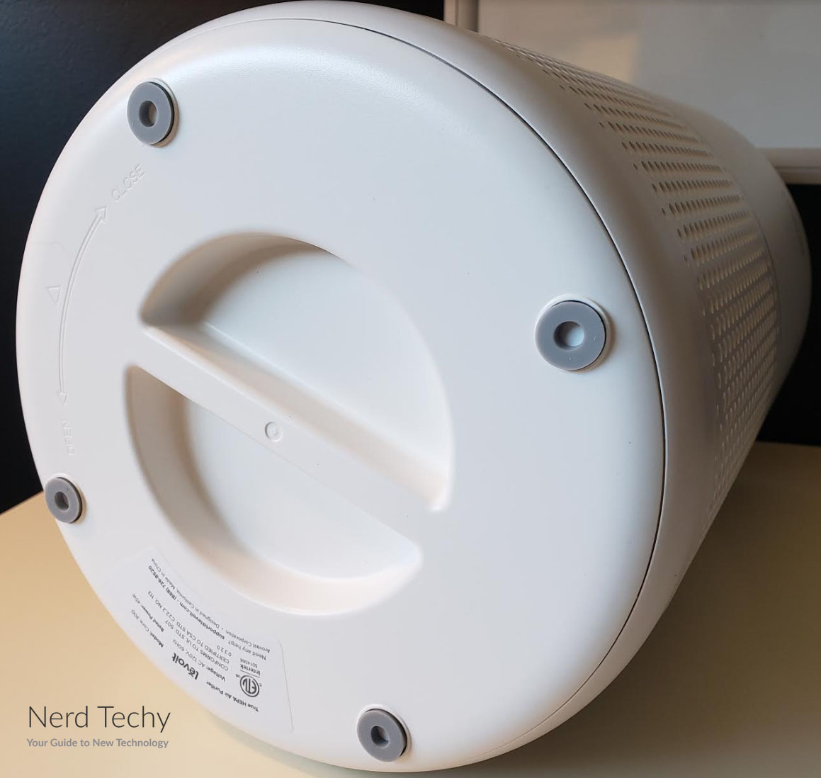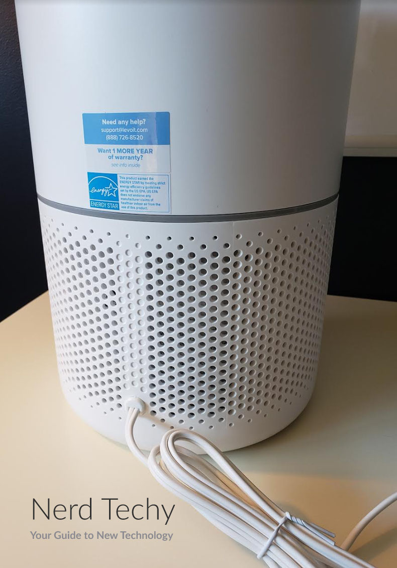 该单元的下半部分装有过滤器。它的外部有一个简单的网格穿孔,允许大量的空气流动。因为它能360度全方位吸入空气,所以当四周畅通无阻时,它的表现最佳。如果它靠墙放置,你会注意到性能下降。在这部分上面是一个灰色的带,标志着外壳可以拧开的地方。这样可以很容易地取下顶部,并根据需要更改过滤器。