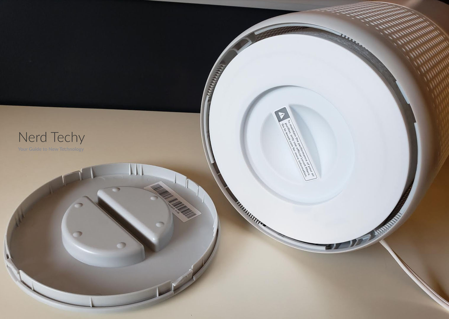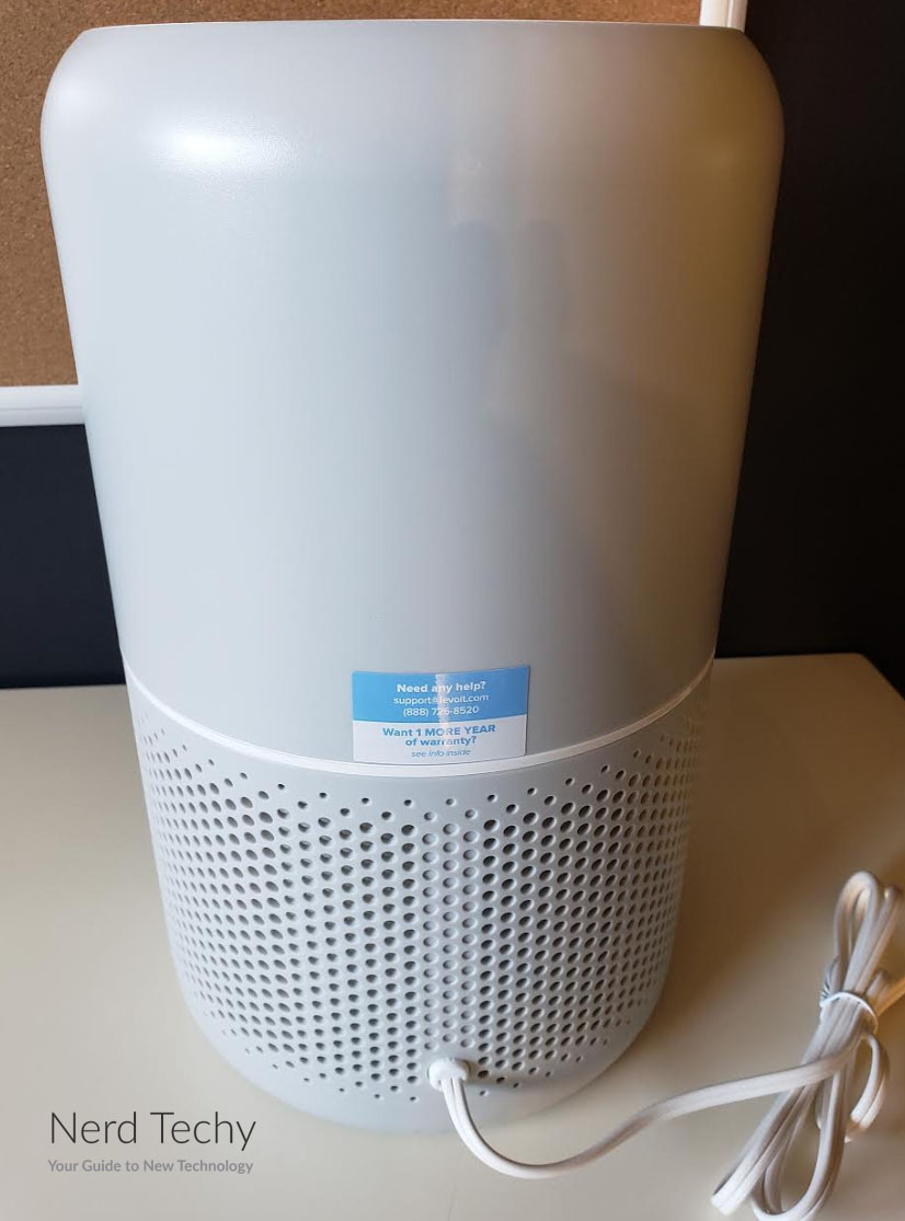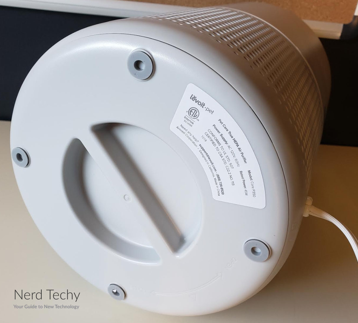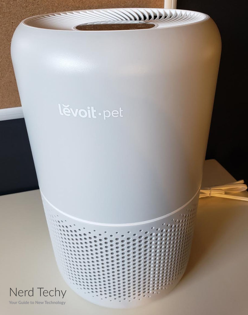 的Levoit核心P350空气净化器是一个紧凑的圆柱体,高14.2英寸,直径8.7英寸。它重8.9磅,这个尺寸感觉有点重。尽管如此,从客观角度来看,它并不是非常沉重,而且玩家很容易从一个房间移动到另一个房间。它也是一个很有吸引力的家居配件。外壳由银色ABS塑料制成,中间有一条白色的带子。该单元的下半部分容纳了过滤器本身。在整个圆周上,有一个进气格栅,由一些小洞组成。在带上面,单位有一个光滑的,有光泽的完成,中断只有一个白色的“Levoit-pet”印记。