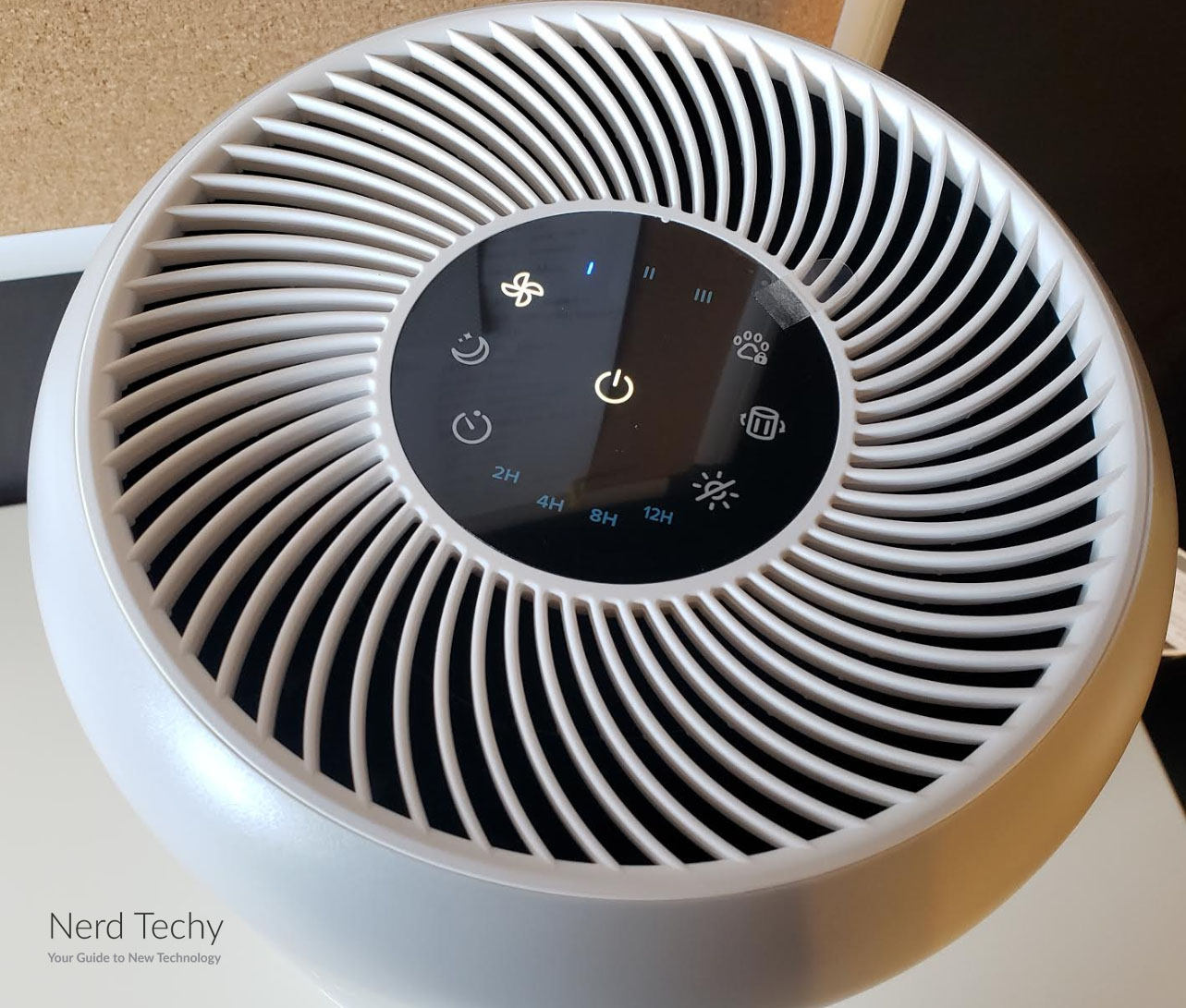 Core P350的顶部是白色的,而不是银色。这提供了一个吸引人的对比,银体的单位。在螺旋通风口的中央,有一个控制面板,它可以操作过滤器的所有功能。一共有7个软触摸LED按钮,电源按钮位于中间。在左边,你会发现风扇速度,睡眠模式,和定时器控制。在右边,你会发现宠物锁,过滤器指示器和显示按钮。当过滤器脏时,过滤器指示灯亮。在你改变了过滤器之后,按下按钮重置它。在顶部,有三个灯指示风扇的速度。在底部,有四个额外的灯指示计时器状态。