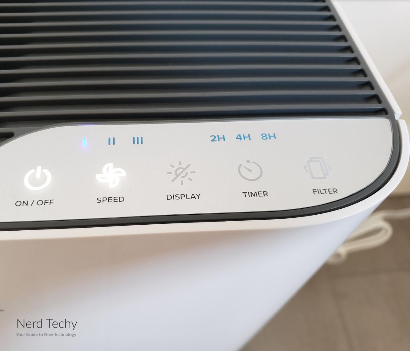 在Vital 100的顶部,有一个灰色的出口,以及一排柔软的触摸控制。右边的按钮是一个简单的开/关控制你的设备上或下。下一个按钮控制风扇转速。点击它可以通过三个不同的选项循环,风扇的强度由一组LED指示灯显示。下一个按钮控制LED照明,所以你可以打开或关闭夜灯。第四个按钮允许您设置一个计时器,并通过不同的时间周期。计时器是完全可选的,所以你可以设置一个时间段或简单地让Vital 100运行。最后一个按钮是过滤指示器。当需要更换过滤器时,它会亮,按下它将重置过滤器计时器。