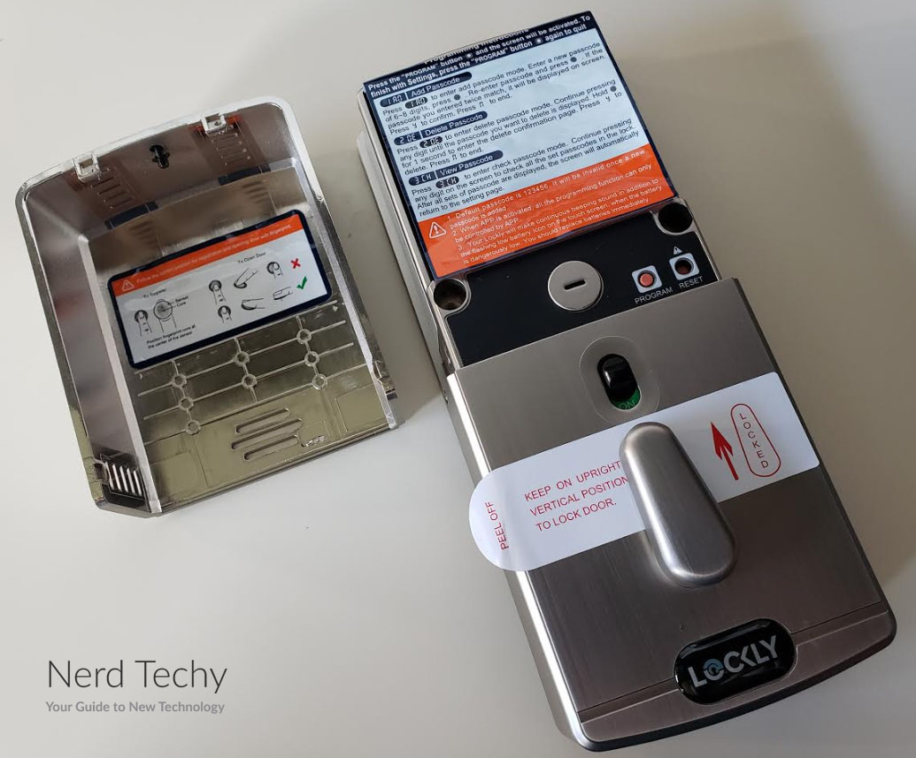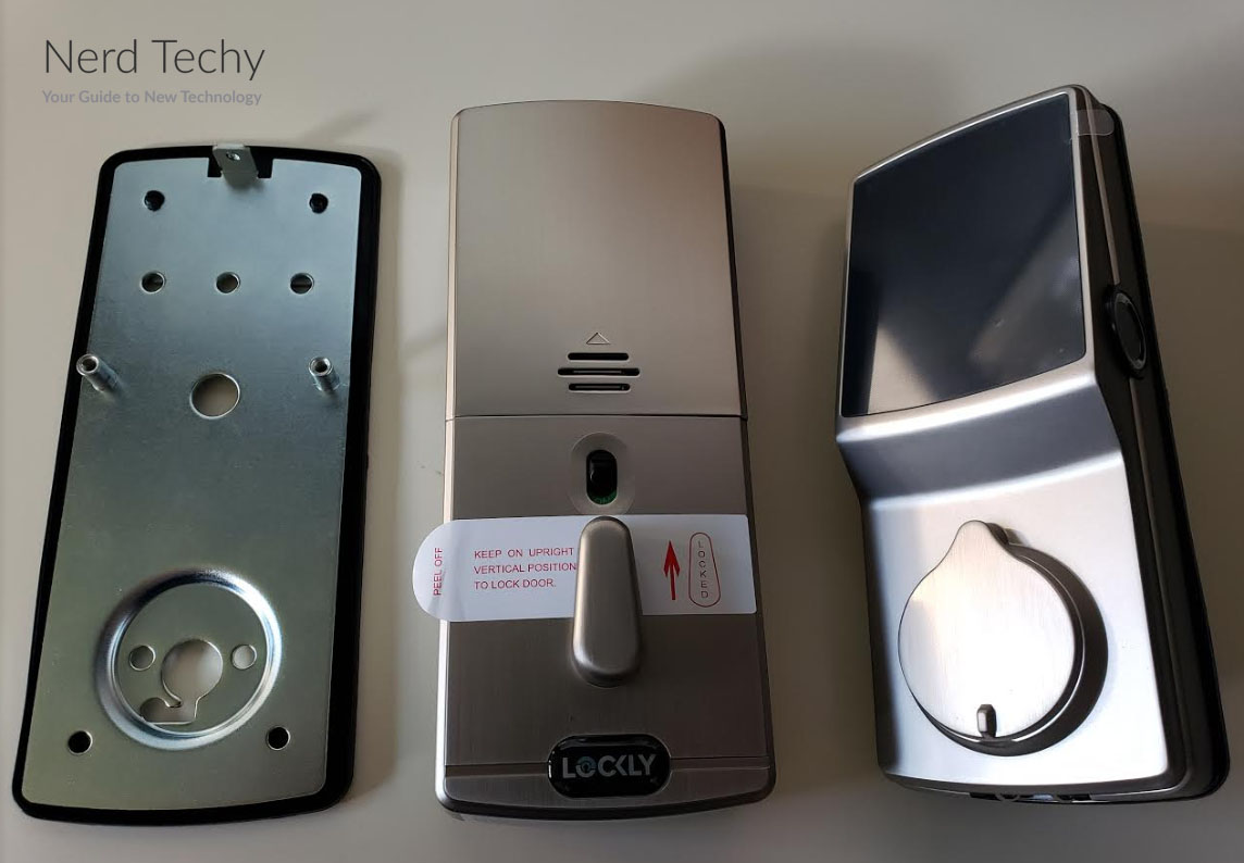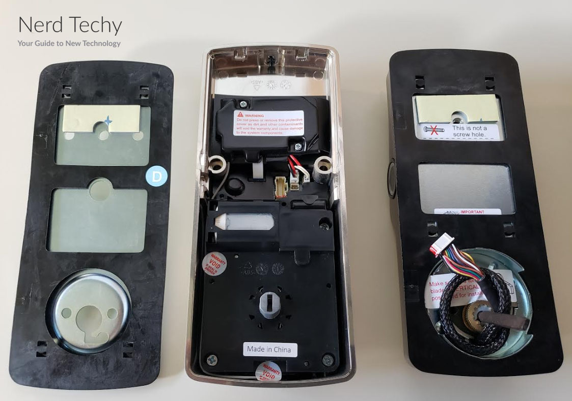 整体设计是有吸引力的。有4种不同的饰面:哑光黑色,光泽的黑色,威尼斯青铜和缎镍。内部部分在底部具有标准止锁切换。在切换上方是一个绿色的导致让您知道锁是工作的。在光之上是一个小型生物识别读卡器,用于用指纹解锁。除此之外,您可以看一块裸晶板,可以拆除,以改变电池。