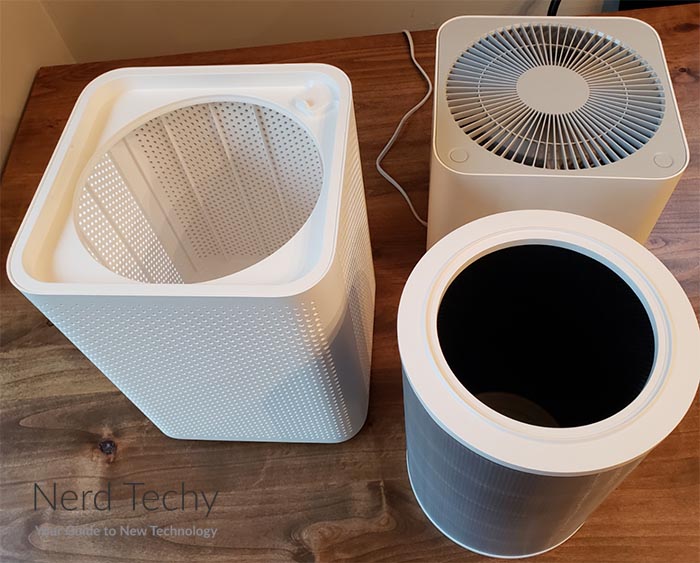 小米3C采用了一个三级过滤系统,类似于许多家庭空气净化器的过滤器。过滤器的外层是一个简单的预过滤器。这是一个普通的网格,用来捕捉最大的颗粒。它可以捕捉大块的灰尘、宠物皮屑和其他可能堵塞更细的内部过滤器的垃圾。净化器就是在这个预过滤器外面的区域读取空气质量读数。