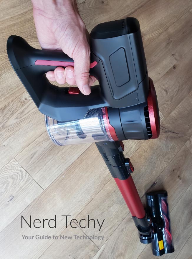 就在电池前面,你会找到马达。它被安置在一个垂直的圆筒里,侧面有通风口以提供气流。电机下方是集尘箱,用于收集真空吸尘器收集的任何碎屑。它是透明的,所以你可以很容易地记录你在里面收集了多少灰尘。这也不错,因为垃圾箱的容量不如大多数垃圾箱大。通常,我们预计真空料斗的容量为500ml至600ml。另一方面,K17的容量仅为400ml。这意味着更频繁的清空,这有点令人失望。另一方面,垃圾箱很容易清空。你按下一个按钮,底部翻开,你的垃圾掉到垃圾桶里。