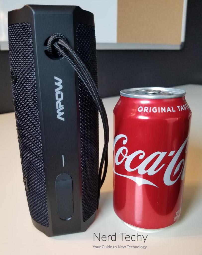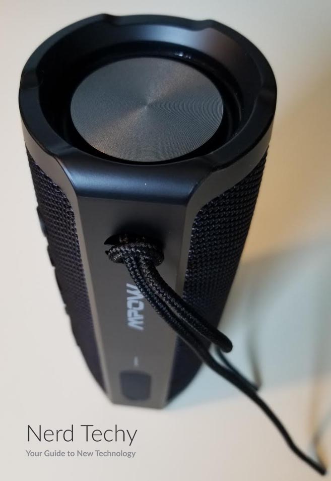 Since Mpow markets this speaker as an outdoor speaker, it’s nice to see that they’ve included anIP等级它的设计。具体来说,R9机型IPX7率d, meaning that it can withstand submersion in up to 1 meter of water for up to 30 minutes. In addition, it can withstand dirt ingress, or dust/debris from entering the body of the speaker. We tossed it around in the dirt and even exposed it to the rain on more than one occasion. To our expectations, it held up just fine and still plays music just as nice as before.