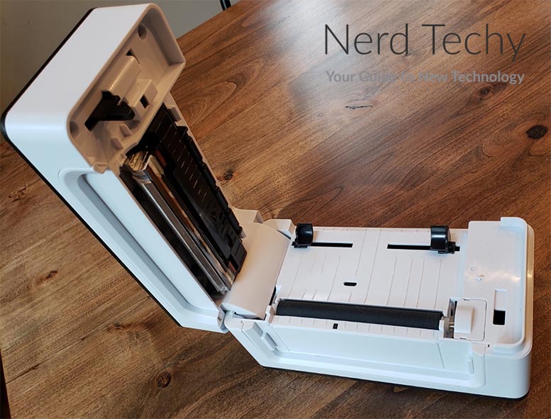 和大多数热敏打印机一样,MUNBYN有一个简单的馈通设计。你的标签插入后面的插槽,完成的标签从前面出来。在前面的槽里,有一排精致锋利的刀片,当你撕下标签时,它会将标签切成薄片。为了喂饱标签,你首先要打开外壳。要做到这一点,滑动右手边的释放,并提起外壳的上半部分。它将从另一边的铰链打开,让内部打开。然后,您可以将标签放在里面,并调整灰色幻灯片将其固定在合适的位置。当您完成时,单击顶部关闭,然后您就可以开始了。
