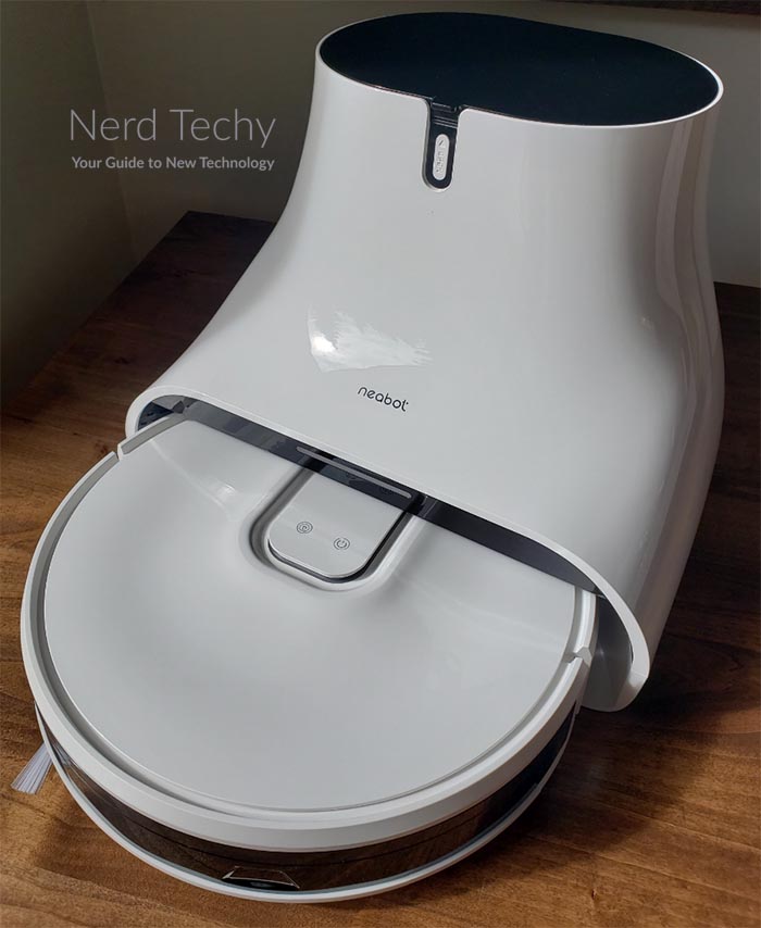 Neabot的充电底座比你在大多数机器人吸尘器上找到的要大一点。这是因为它还充当了自清空功能的转储。我们稍后会详细讨论,但重点是基础很大。你会想把它放在一些不碍事的地方,比如洗衣房,或者它很容易碍事。当真空到位时,尤其如此,而且会进一步突出。
