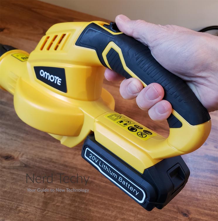 它的主要外壳是亮黄色的,所以如果你把它放在外面的草坪上很容易发现。电机在中心,在一个梯形的外壳与冷却通风口的两侧。在通风口下方,房屋两侧也有灰色和白色的OMOT标识。形状在马达下面展开,形成一个宽阔的甜甜圈形状的底座。这个基地容纳了风扇,它直接连接到电机的底部。风扇通过底部的圆形通风口把空气吸进去,然后从前面吹出去。确保底部区域畅通无阻,否则你就不会有太大的风力。