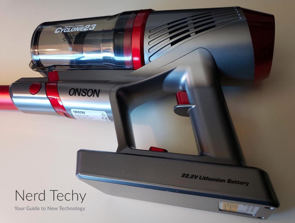 的Onson EV696与大多数棒状真空吸尘器的设计相似。这是一个一体机,设计为单手使用。你用一个简单的手枪握把它,类似于大多数无线演习的握把。同样类似于无线钻,电池被直接安置在手柄下面。这提供了极好的平衡,因为它使真空底部重,而不是前重或后重。进一步加强平衡的是电机的位置。它的位置高于抓地力和稍后。这增加了一点重量的背部,平衡了单位的前面部分。