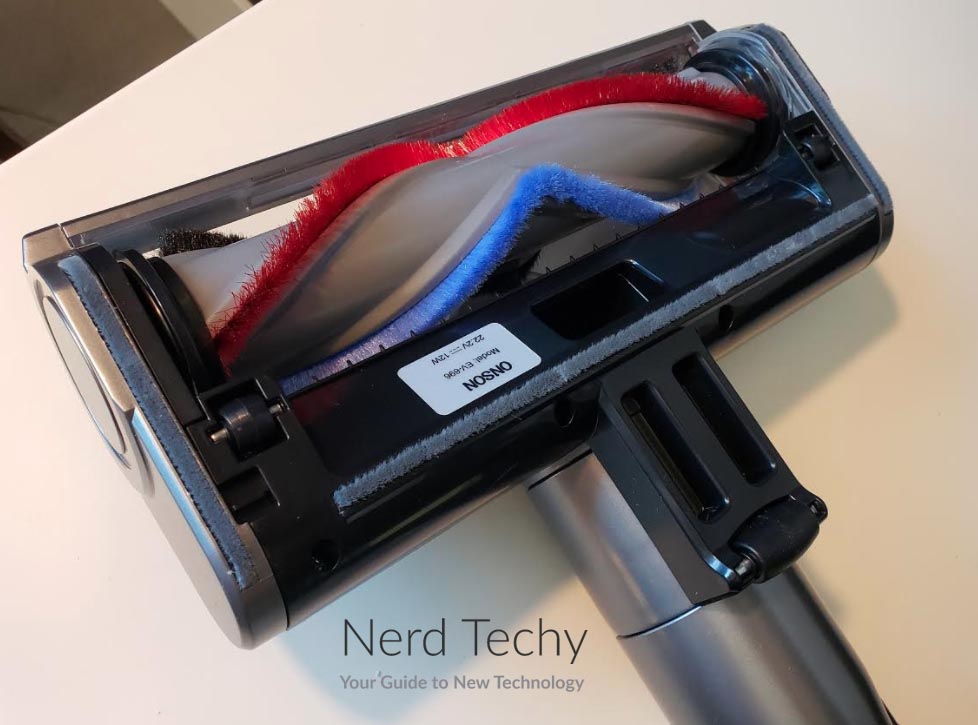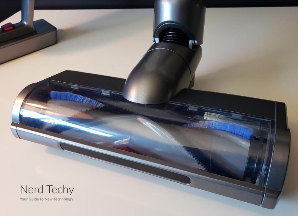 主要的附件是一个宽度刚刚超过11英寸的大滚筒头。它有一个v型的刷子,可以毫不费力地将灰尘引导到吸管底部。长短交替的刷毛为任何长度的地毯提供完美的清洁。不过要记住,更深的地毯可能更难清洁。如果你有一个深绒地毯,考虑使用11000pa设置。在较短的地毯上,7000pa的速度就足够了。当你在家具下面的时候,你就能看得很清楚。电刷前面的一组led可以提供足够的照明。