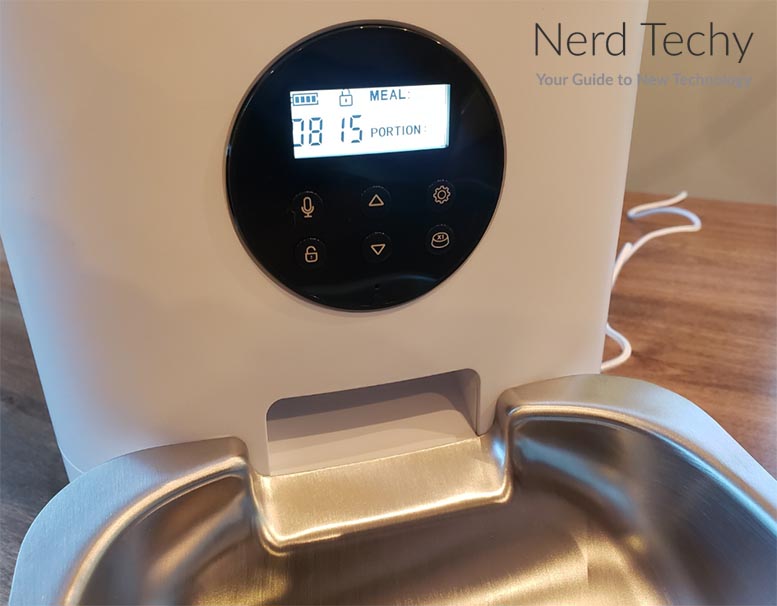 在料斗的前面,你会发现一些基本控制。有一个语音记录按钮,一个重置按钮和一个大按钮,可以手动喂养宠物。这些按钮可轻松用于培训,让您的猫或狗用于自动进纸器。但是,没有办法停用手动进纸按钮。如果你有一个好奇的猫,他们可能会弄清楚如何喂养自己。