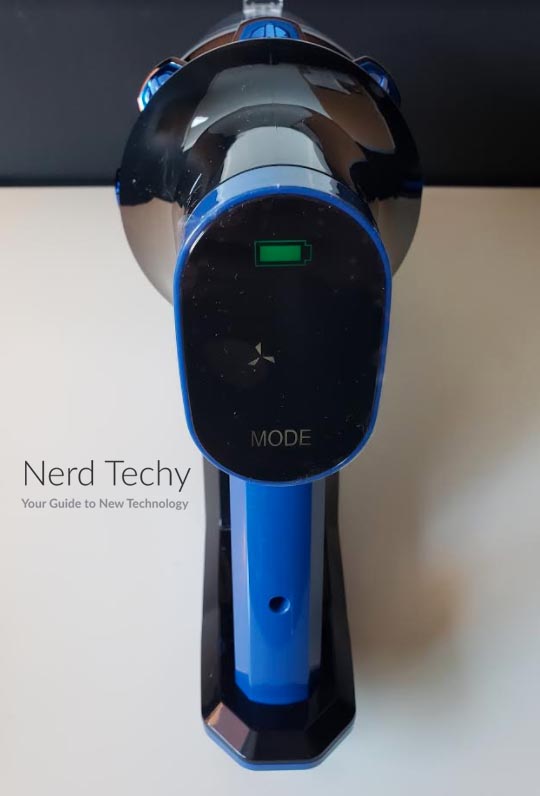 在背后的手枪握,你会发现一个液晶触摸屏显示。显示器是相对简约的,但仍然允许大量的功能。在最顶端,有一个电池表。它有一个迷人的绿色三栏设计。在那下面,有三个错误代码灯。这些灯通常是关着的,但会在堵车或其他故障时亮起来。在底部,有四个风扇转速灯。只需点击灯来选择一个特定的风扇转速。您可以从非常低的6,500帕斯卡(Pa)调整到强大的最大22,000Pa。当你不需要全功率的时候,可以通过调整电机转速来节省电池。