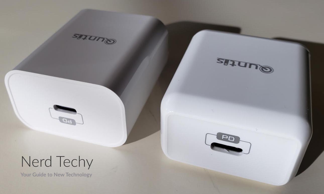 的Quntis 18-watt和30瓦快速充电器在大多数方面都是相似的。它们都是小型AC适配器,背面有一个USB Type-C端口。在30瓦单位的住房是有点坚固,但只是稍微。这两款充电器都是白色的,而18瓦的充电器则是黑色的。在这两款充电器上,背面的PD端口都是清晰的灰色标记。上面还有一个灰色的quuntis标志。除此之外,它们都很普通。